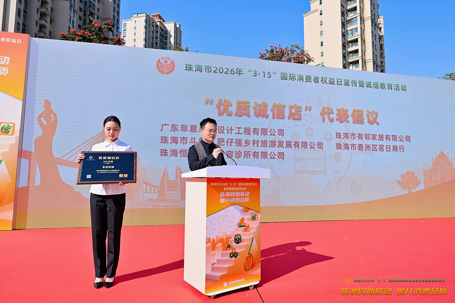 在近日举行的珠港澳诚信店合作共建大会上,非意装饰凭借持续的诚信经营表现,正式获评 「2025 年度珠港澳优质诚信店」,并被授予黑金荣誉牌匾。