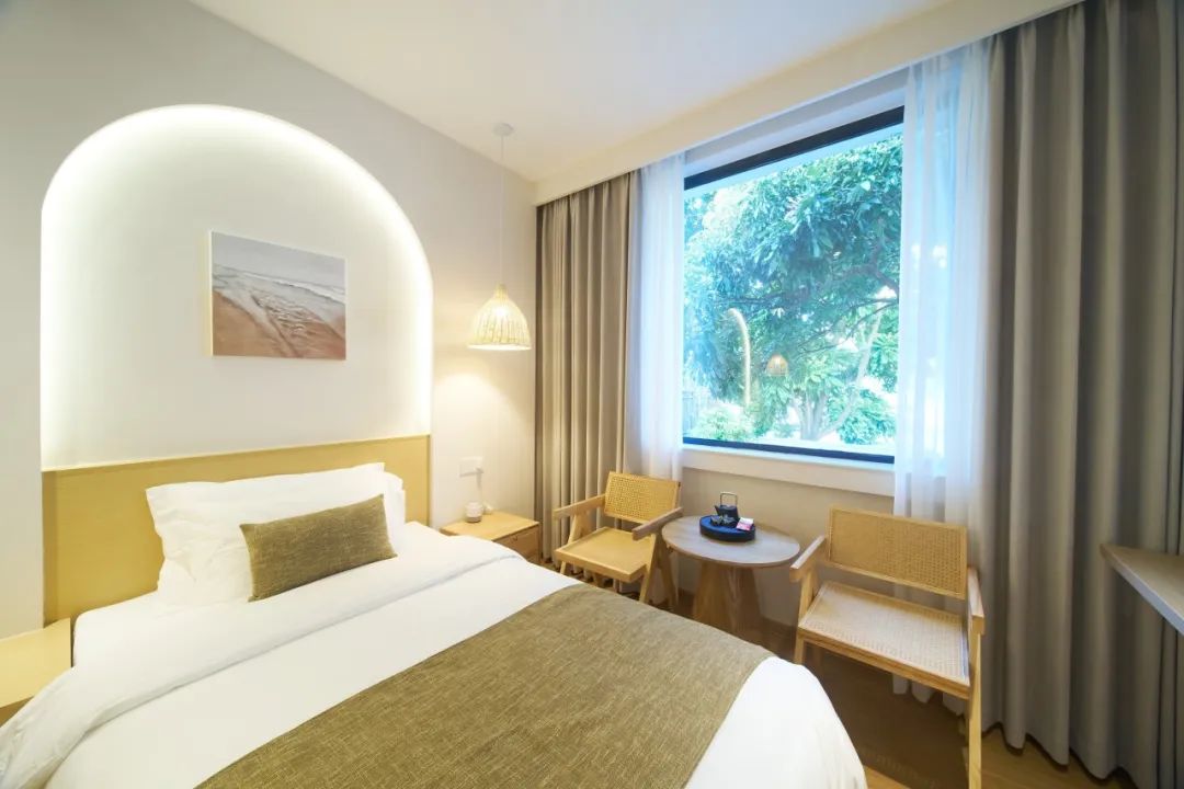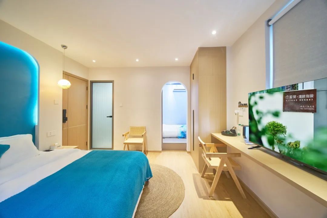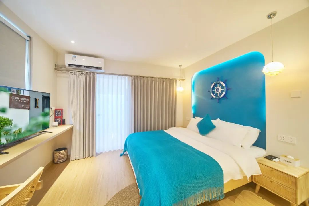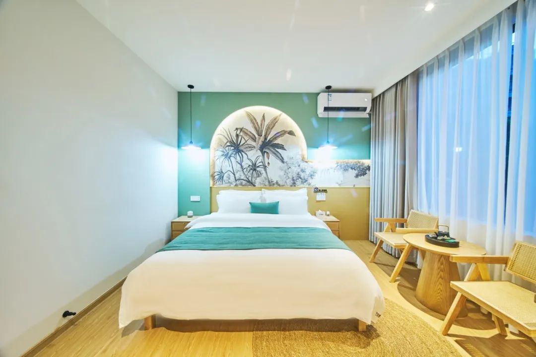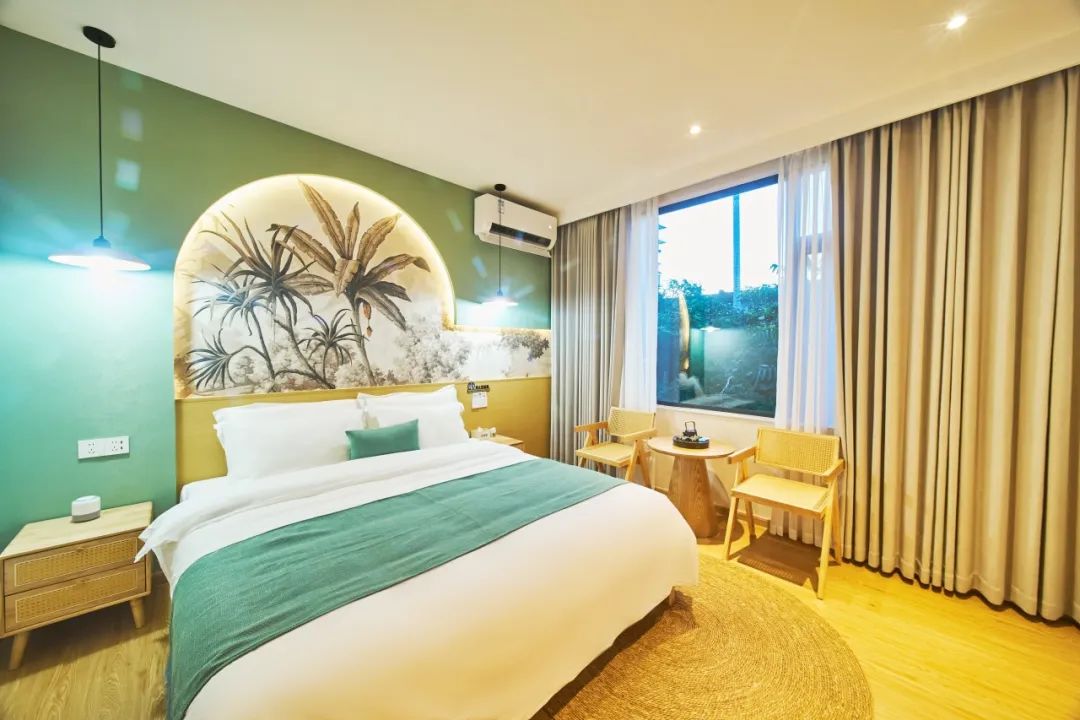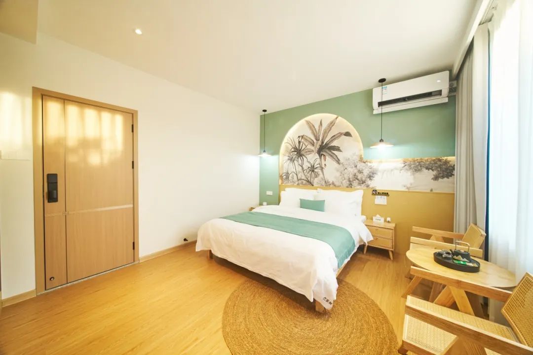 民宿由一栋双拼别墅改造而成,自带一岭南庭院,白色建筑立面简洁而具有设计感,建筑层数2层,共计4间特色客房(其中3间用作民宿经营),客房命名颇具热带滨海风情,分别为海风房、椰风房和林风房。民宿内部装饰为现代简约人文风,融合奶油风、中古风等网红风格,设有榻榻米、情侣大床、标准双床、家庭亲子房等多种主题房型。