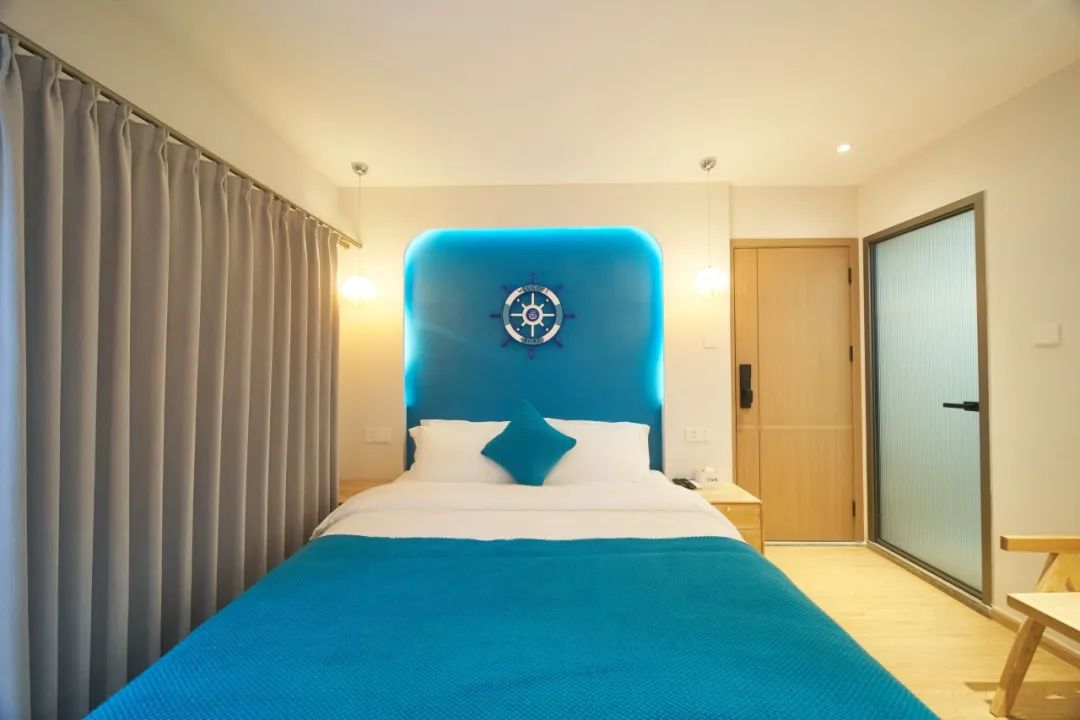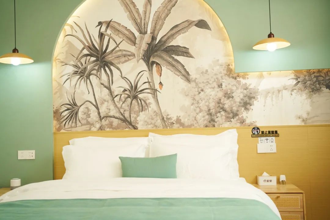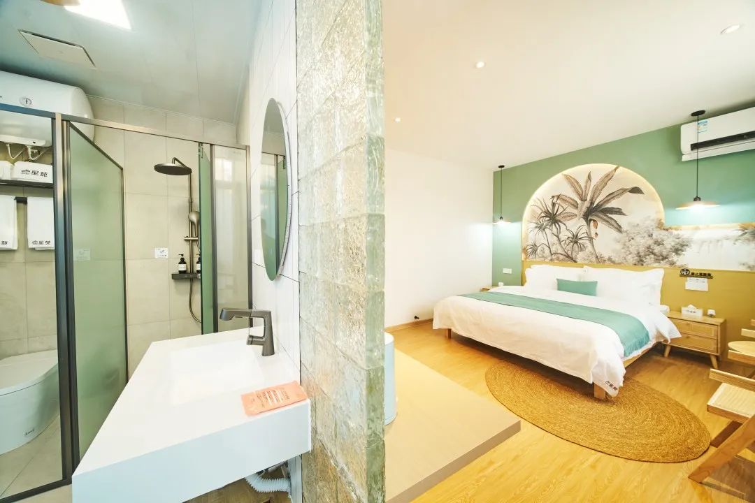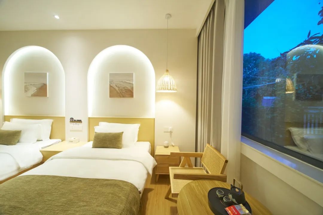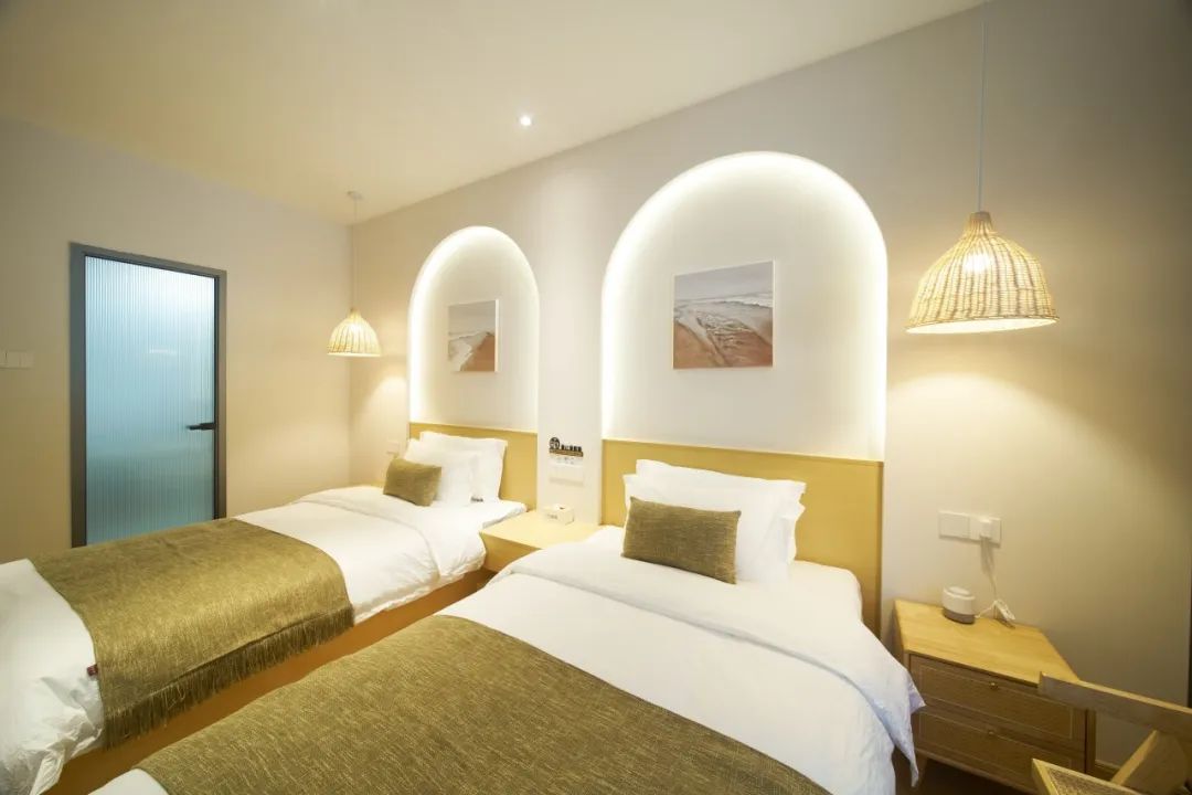 民宿由一栋双拼别墅改造而成,自带一岭南庭院,白色建筑立面简洁而具有设计感,建筑层数2层,共计4间特色客房(其中3间用作民宿经营),客房命名颇具热带滨海风情,分别为海风房、椰风房和林风房。民宿内部装饰为现代简约人文风,融合奶油风、中古风等网红风格,设有榻榻米、情侣大床、标准双床、家庭亲子房等多种主题房型。