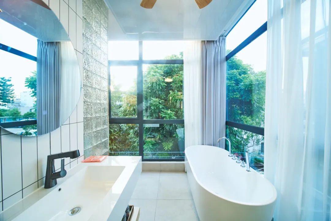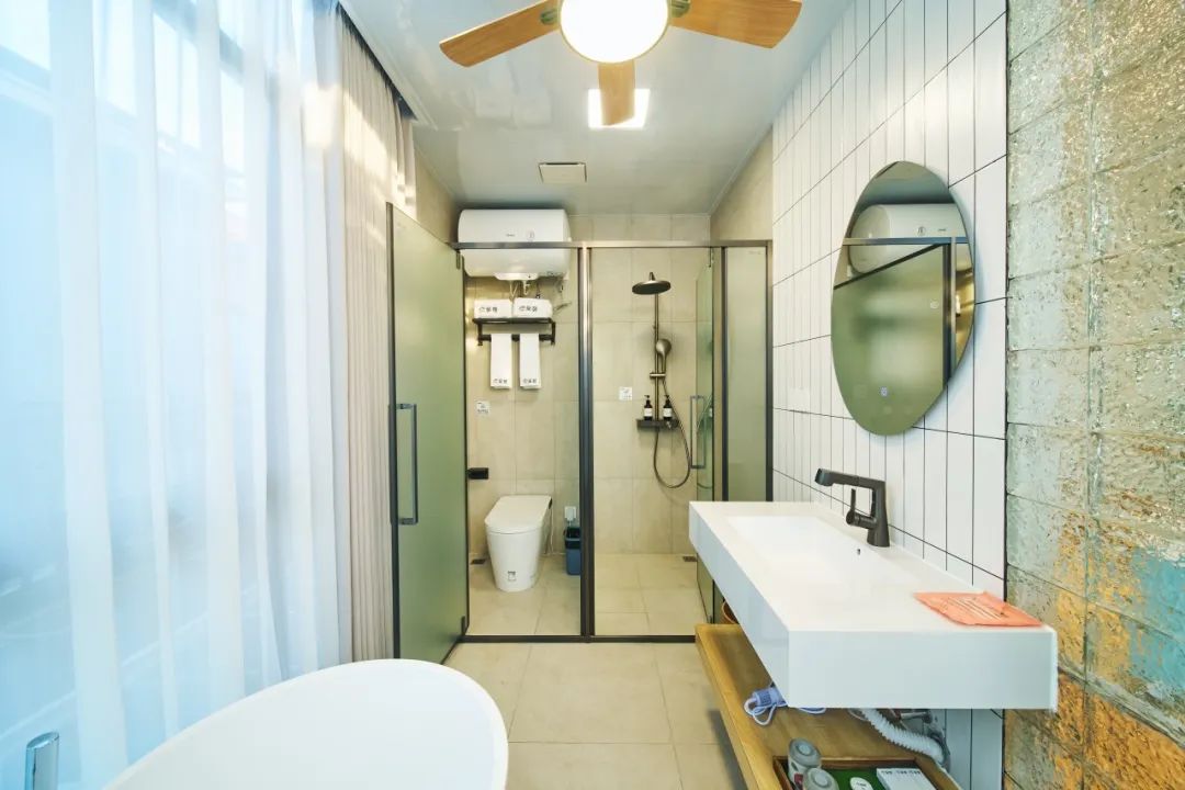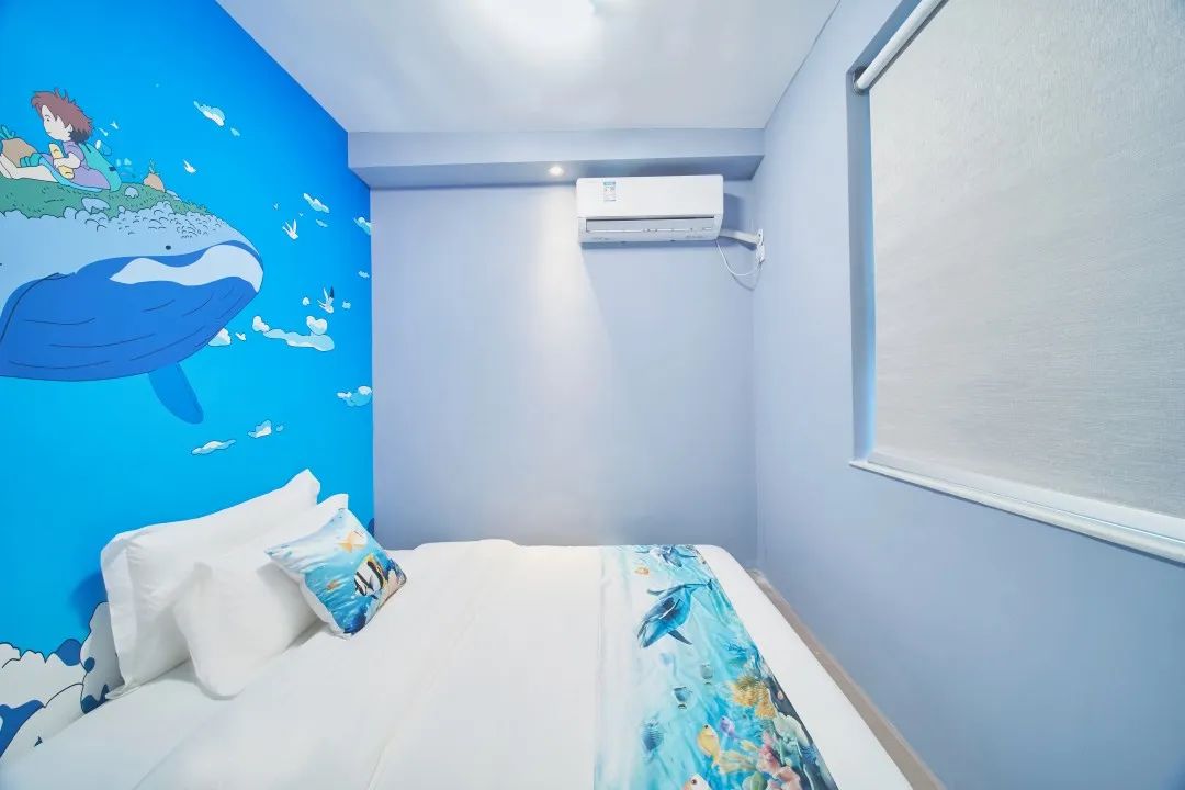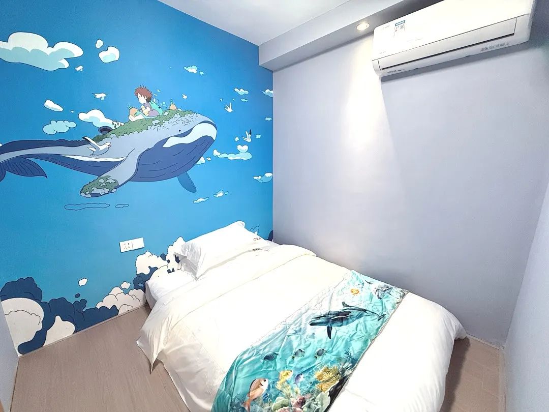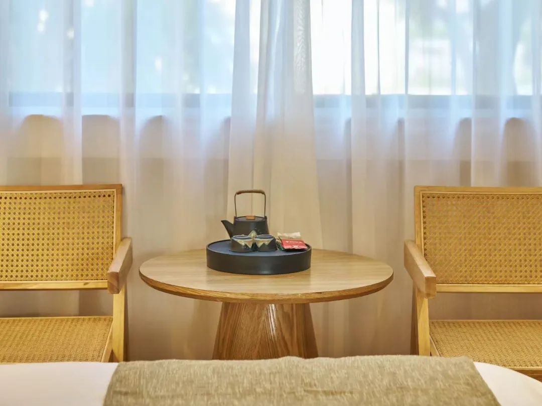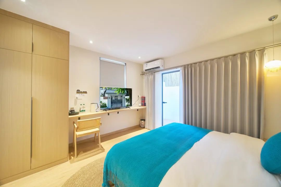 民宿由一栋双拼别墅改造而成,自带一岭南庭院,白色建筑立面简洁而具有设计感,建筑层数2层,共计4间特色客房(其中3间用作民宿经营),客房命名颇具热带滨海风情,分别为海风房、椰风房和林风房。民宿内部装饰为现代简约人文风,融合奶油风、中古风等网红风格,设有榻榻米、情侣大床、标准双床、家庭亲子房等多种主题房型。