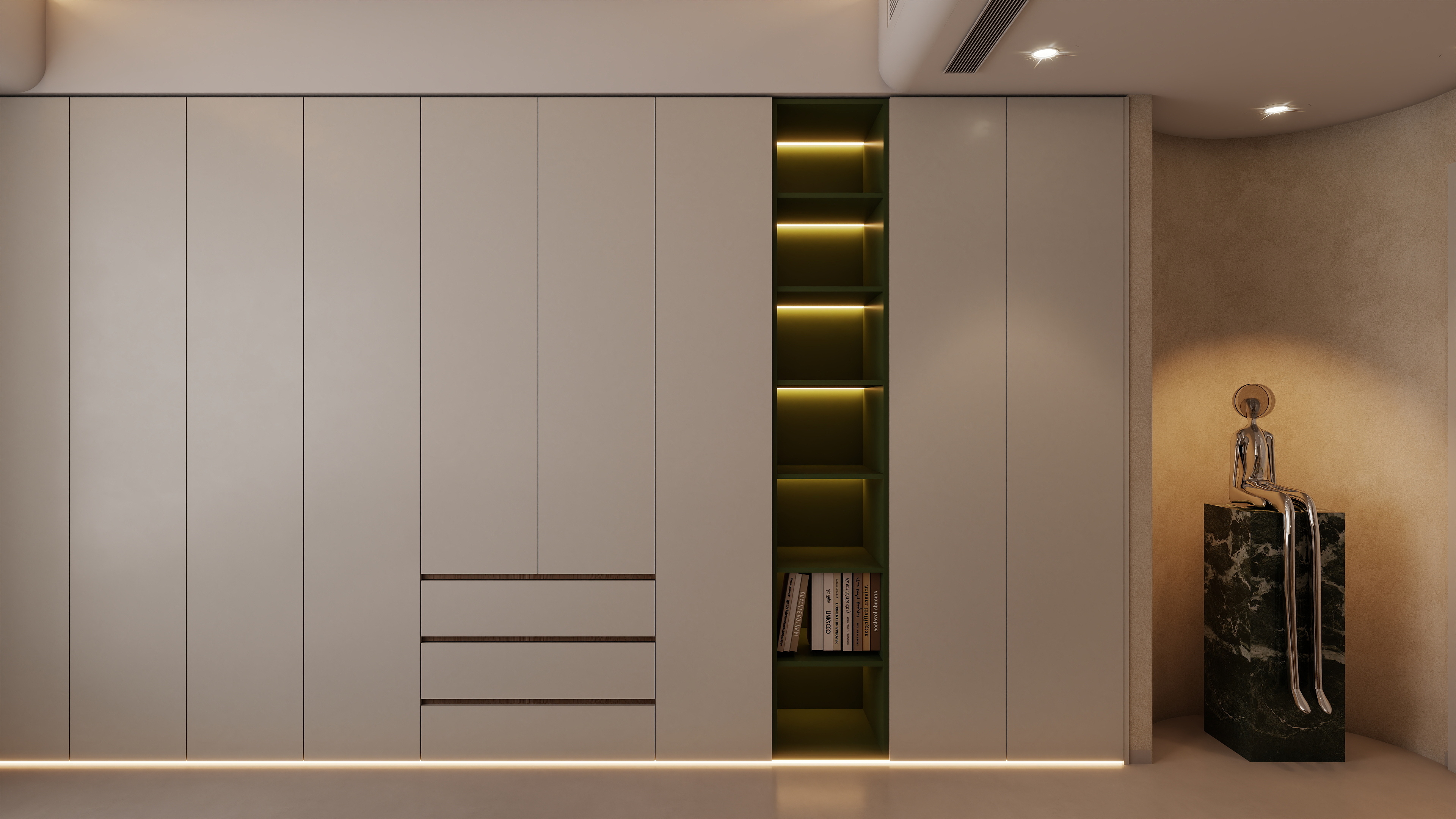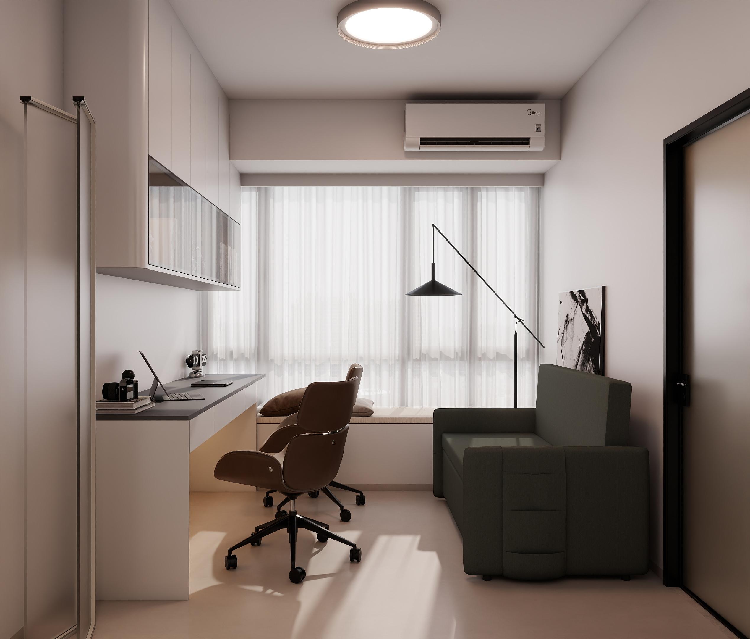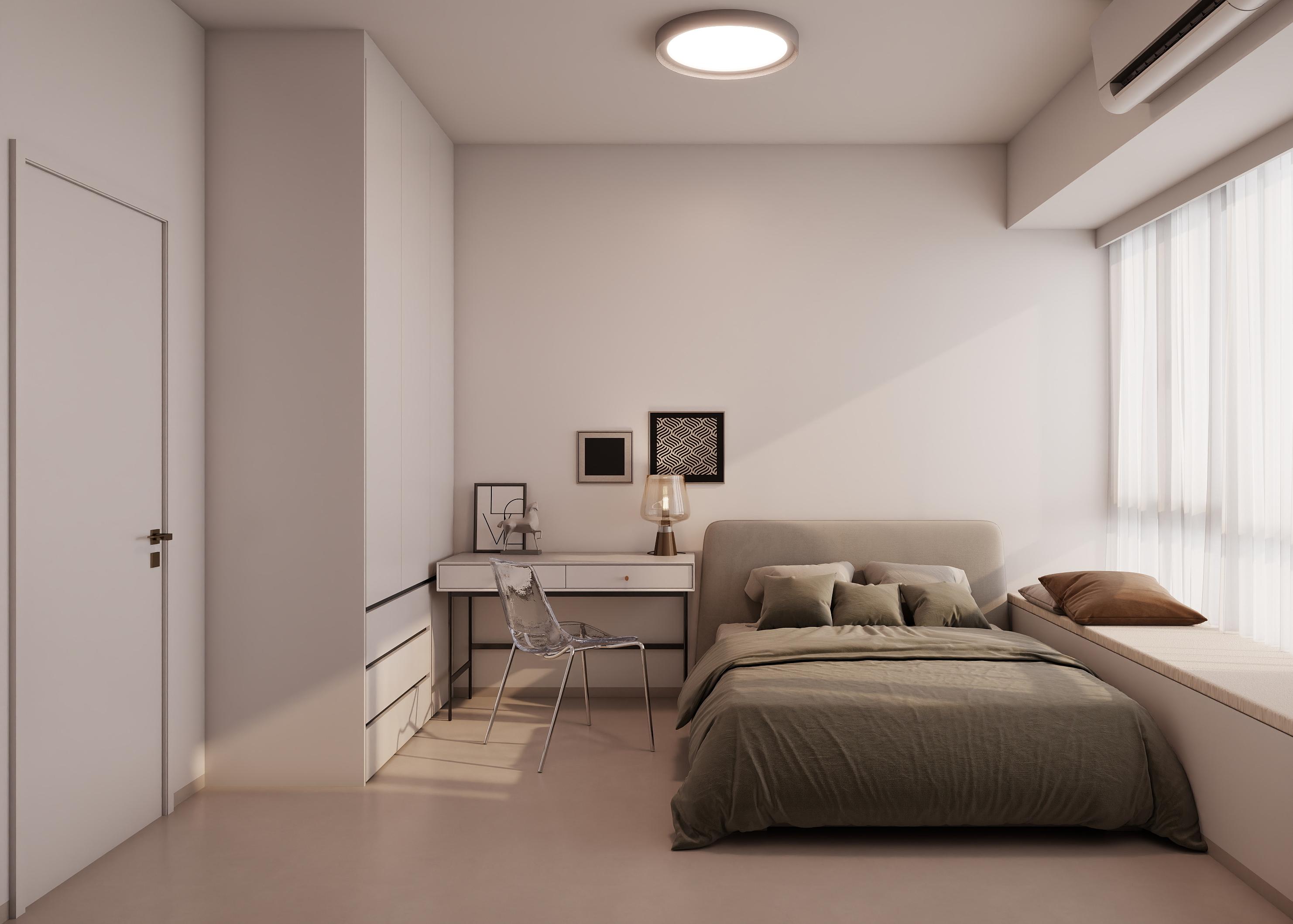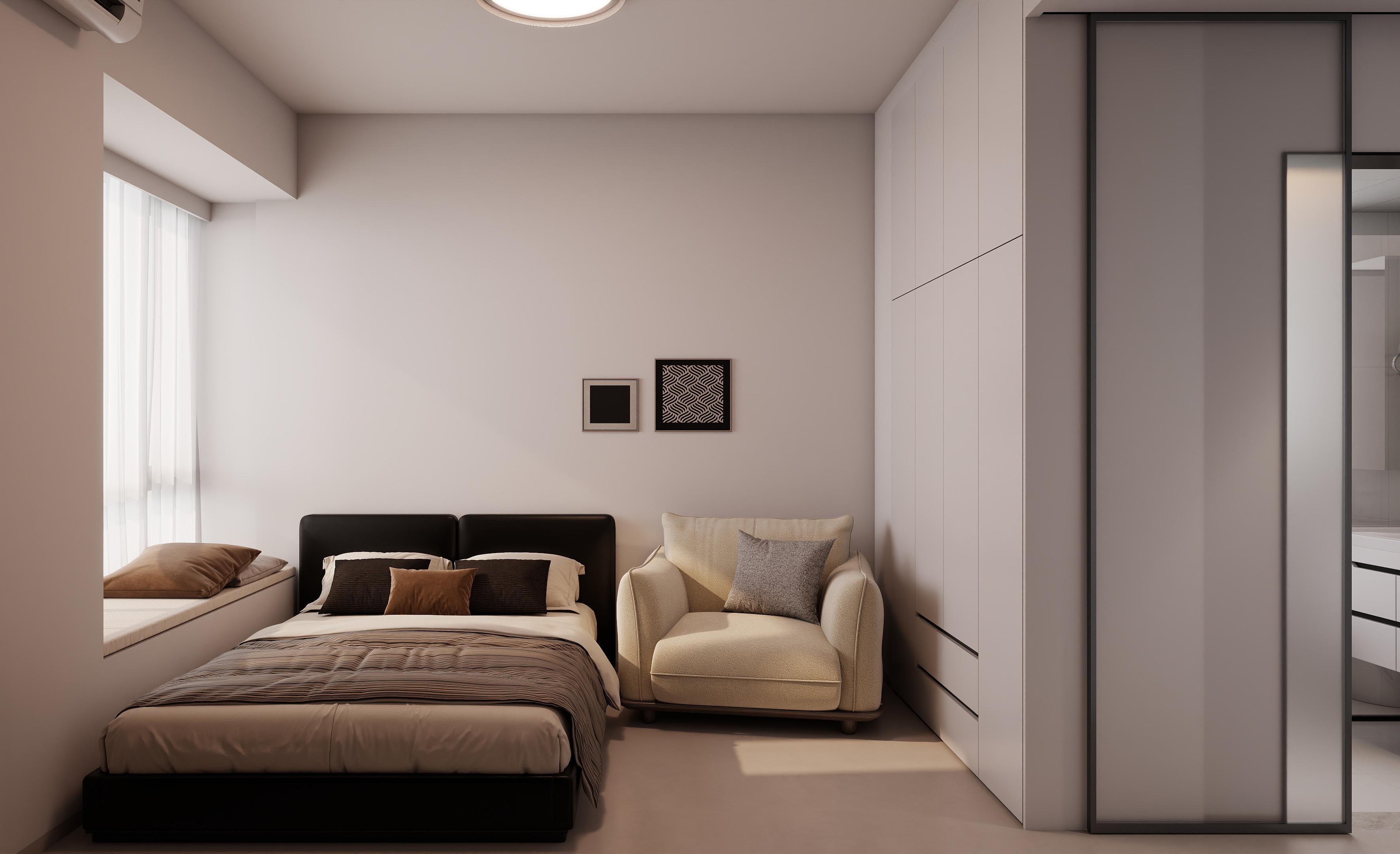 卧室作为休息的主要空间,设计上以营造舒适、宁静的氛围为核心。选用柔和的色调,如白色、米色、灰色等,搭配柔软的床品和地毯,提升舒适度,设计了充足的收纳空间,如定制衣柜,满足衣物等物品的收纳需求,同时,飘窗区域被巧妙利用,设计成休闲区,增加空间的功能性,采用柔和的照明方式,如吸顶灯、床头灯等,避免强光刺激,保证休息时的舒适度