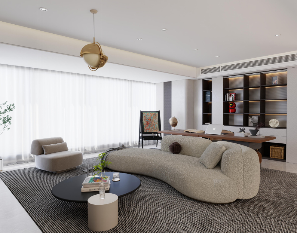 沙发与茶几:弧形的浅米色沙发造型独特,搭配黑色圆形茶几,形成柔和与硬朗的对比。茶几上的书籍和绿植为空间增添了生机与文化气息。
