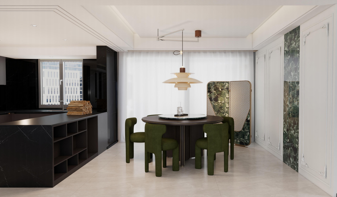 餐厅采用了深色木质圆桌和绿色绒面餐椅,营造出温馨而高雅的用餐环境。吊灯的设计独特,提供了充足的照明,同时也成为空间的视觉焦点。旁边的黑色大理石岛台不仅增加了操作空间,还可以作为早餐吧或社交区域。大理石材质与深色木质形成对比,提升了空间的质感。背景墙上的绿色大理石装饰与餐椅颜色相呼应。