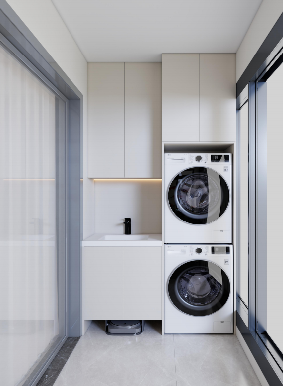 阳台被巧妙地设计成洗衣和收纳空间。定制柜与洗衣机:白色的定制柜将洗衣机和烘干机完美嵌入,节省了空间,同时提供了充足的储物空间,用于存放清洁用品等杂物。洗手池:洗手池的设置方便了日常的洗衣和清洁工作。