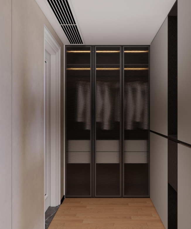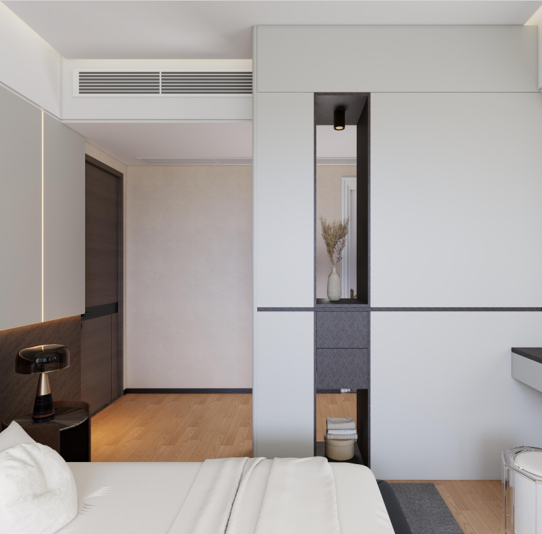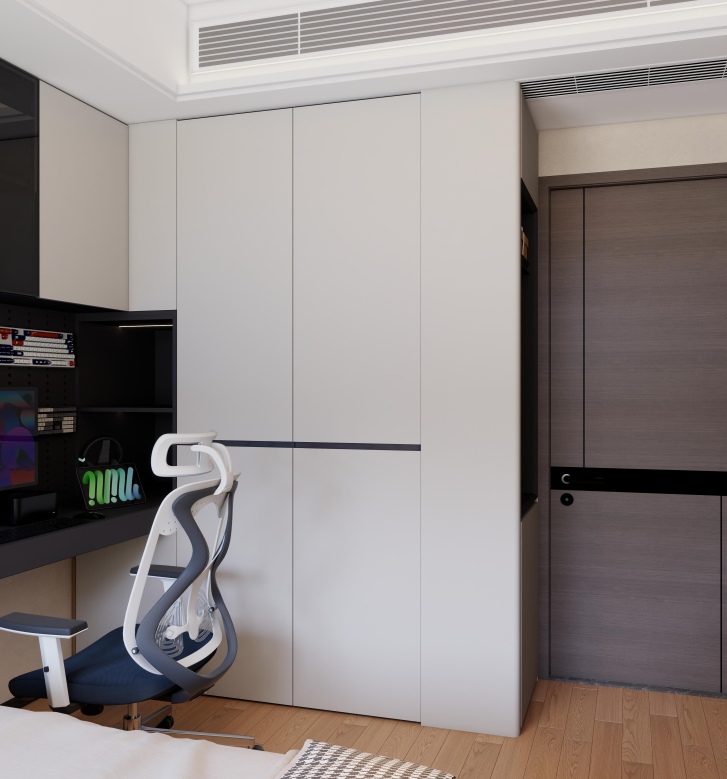 衣柜:定制的白色衣柜与黑色装饰条相结合,增加了设计感,提供了大量的衣物收纳空间。