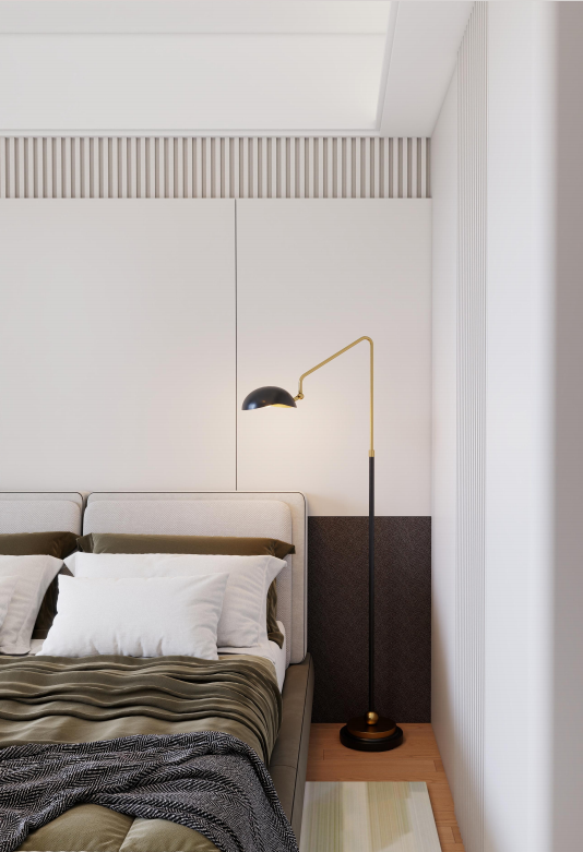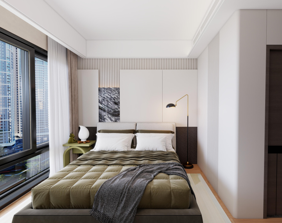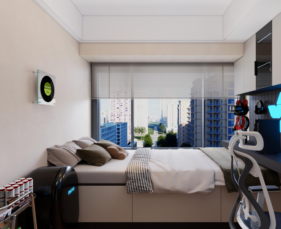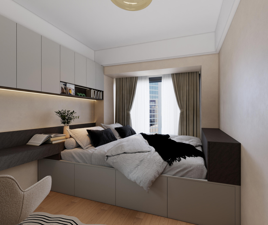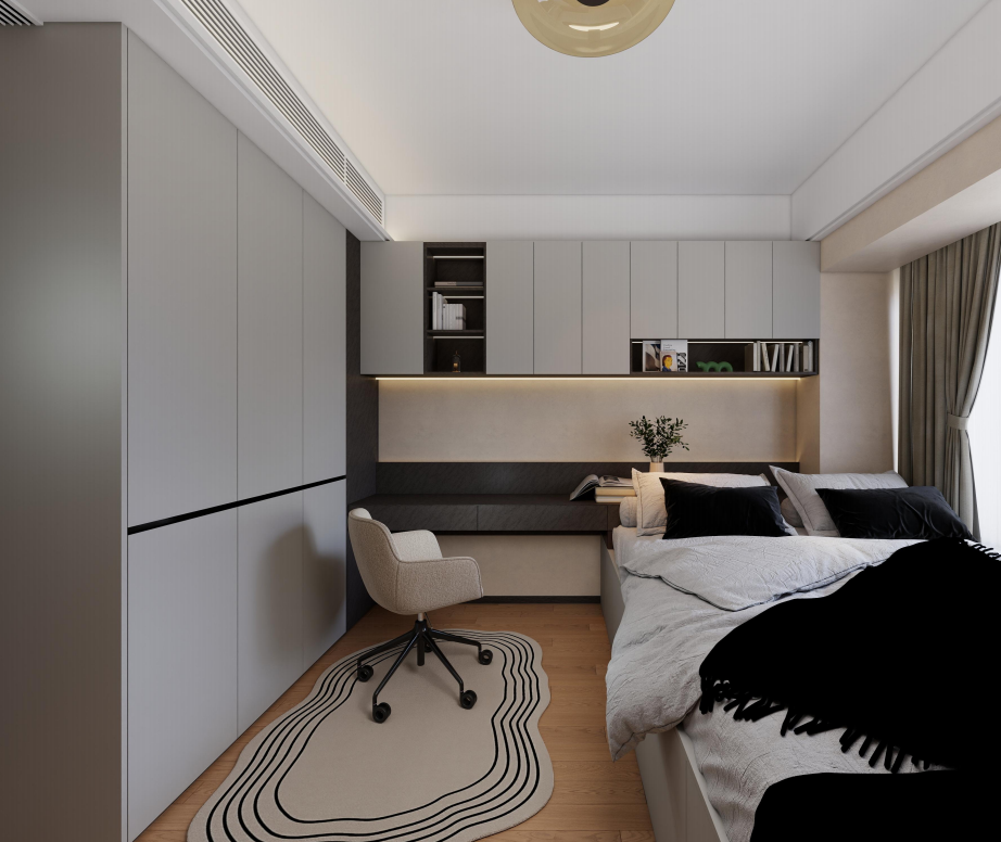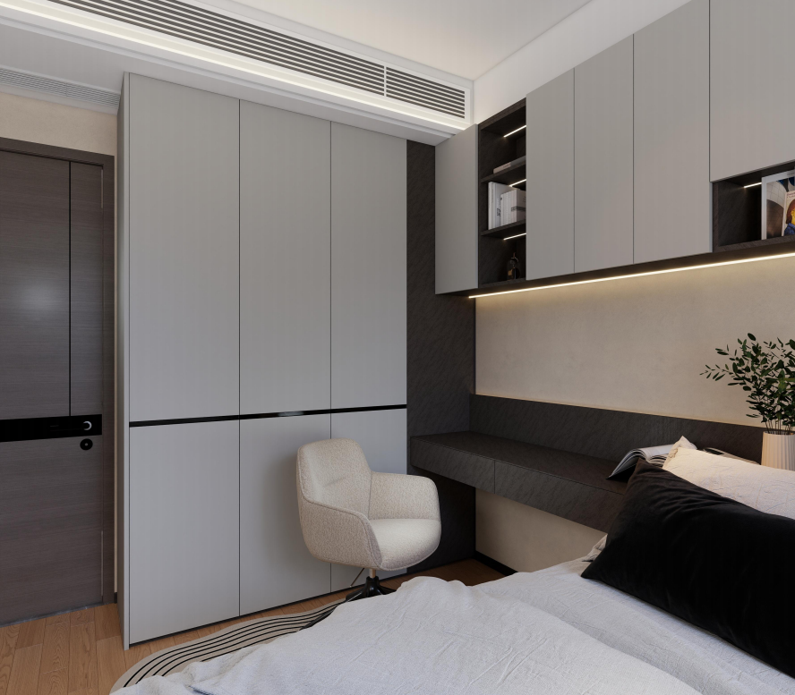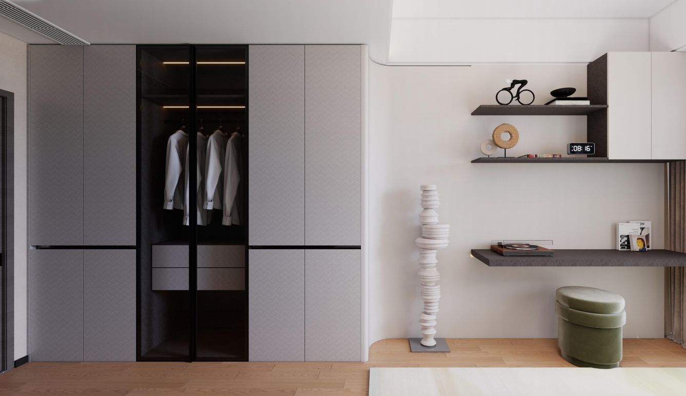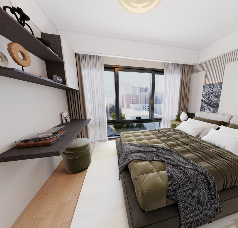 飘窗与书桌:飘窗区域设计了悬浮式书桌,可作为化妆或工作空间,同时可以欣赏窗外的城市景观。