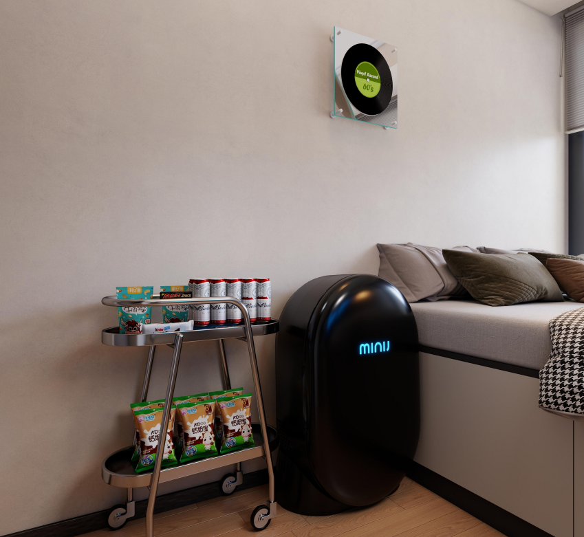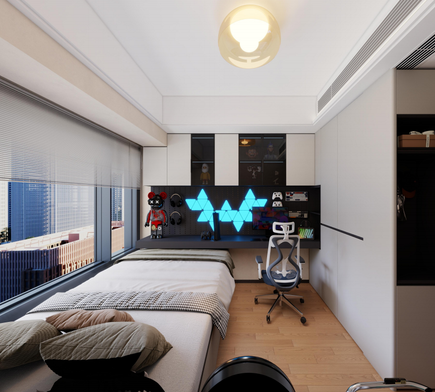 床与电竞设备:简约的床满足休息需求,床对面的墙面设计了电竞设备展示和收纳区,蓝色的灯光墙板增添了科技氛围。