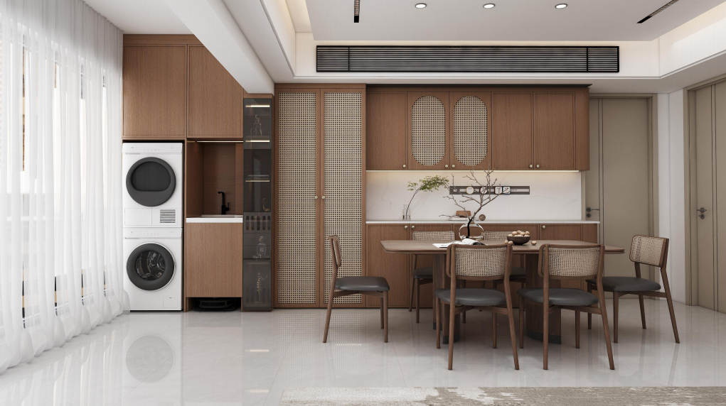 定制餐边柜与洗衣区:餐厅一侧的定制餐边柜采用深浅木色搭配,既美观又实用。柜子集成了洗衣区,将洗衣机和烘干机嵌入其中,节省了空间,同时旁边的储物柜和开放格可以存放洗涤用品和常用物品。