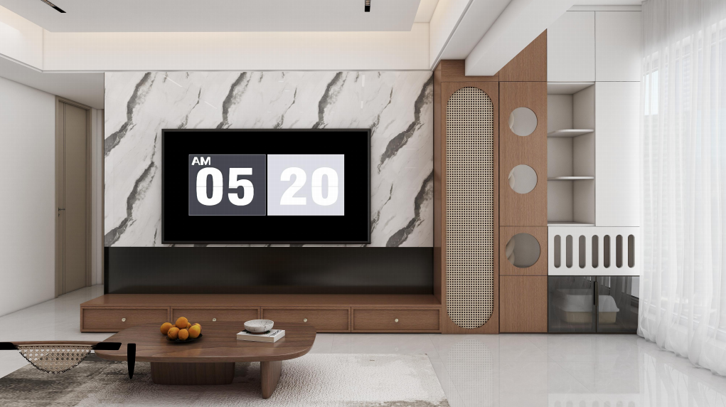 电视背景墙:电视背景墙采用大理石纹理设计,与餐厅的装饰相呼应,整体感强。下方定制的木质电视柜提供了充足的收纳空间,可以存放影音设备、书籍等物品。