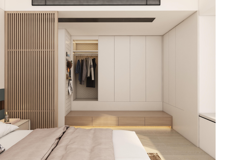 定制衣柜:主卧定制了整排的白色衣柜,提供了大量的衣物收纳空间。衣柜部分柜门采用无把手设计,使外观更加简洁流畅。
