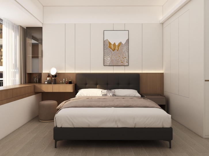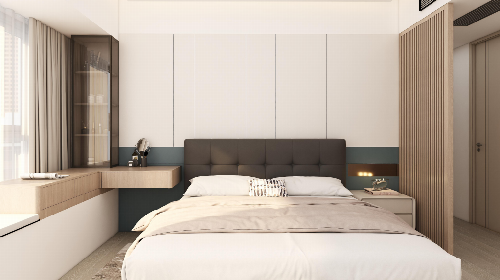 床头背景墙:床头背景墙采用白色与深绿色拼接的设计,简洁而富有层次感。定制的悬空床头柜与背景墙相连,节省空间且方便使用,上面摆放的圆形化妆镜和化妆品增添了生活气息。