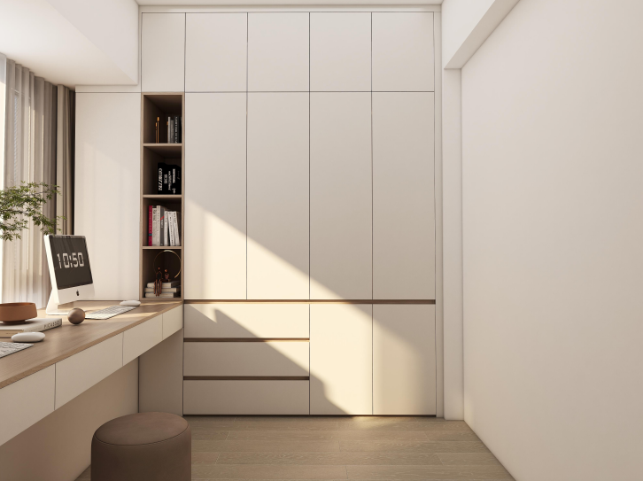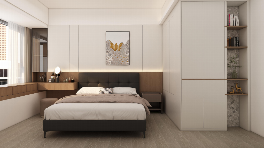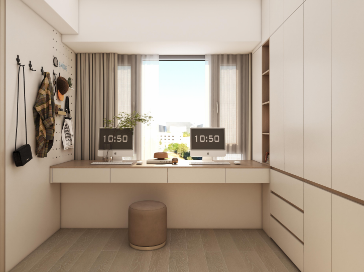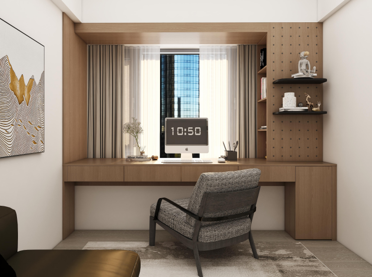 书桌与书架:窗边定制了长书桌和书架,满足了学习、工作的需求。书架上可以摆放书籍和装饰品,增加了空间的文化氛围。
