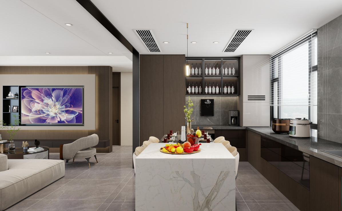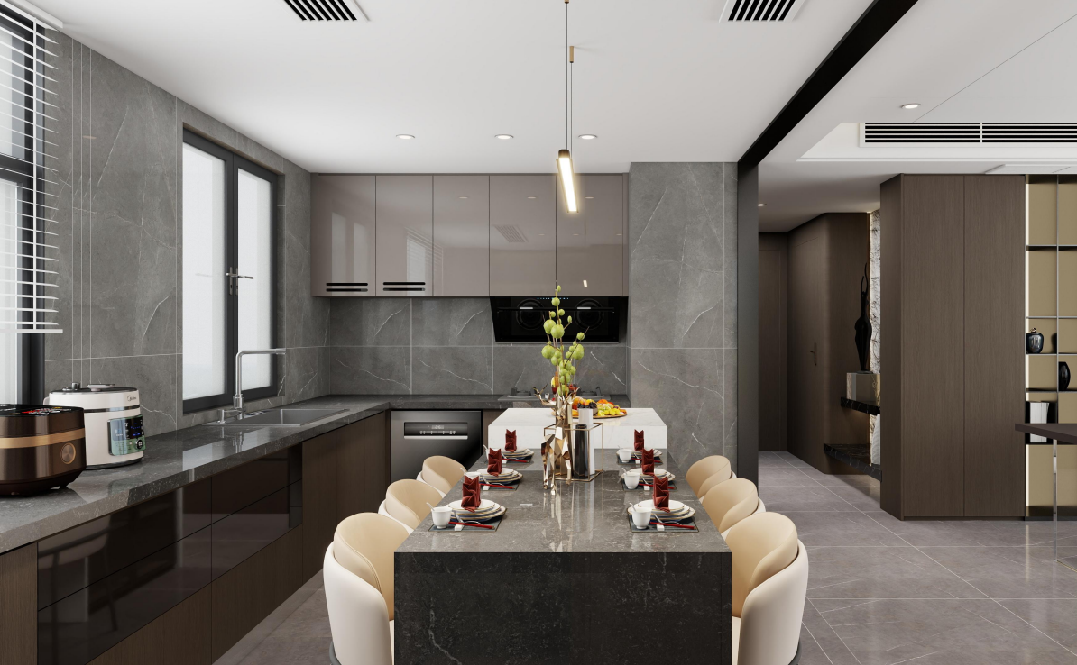 餐厅:定制的大理石餐桌成为餐厅焦点,搭配造型优雅的餐椅,既实用又美观。餐桌旁的定制餐边柜,提供了丰富的收纳空间,可存放餐具、酒品等物品,方便日常用餐需求。整体设计简洁大方,与客厅风格相协调,形成开放且互动性强的公共空间