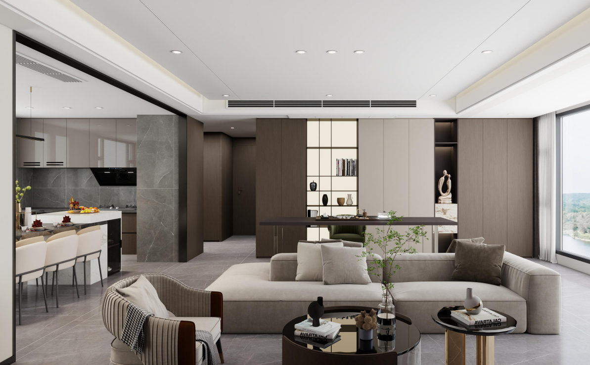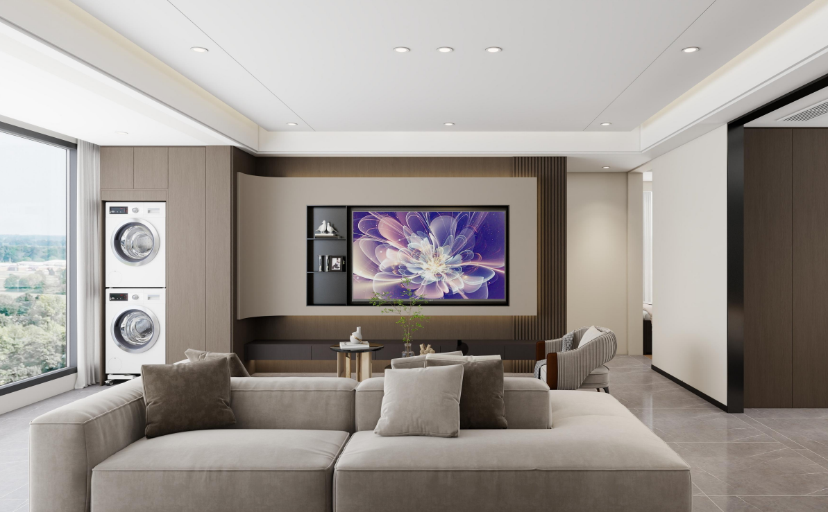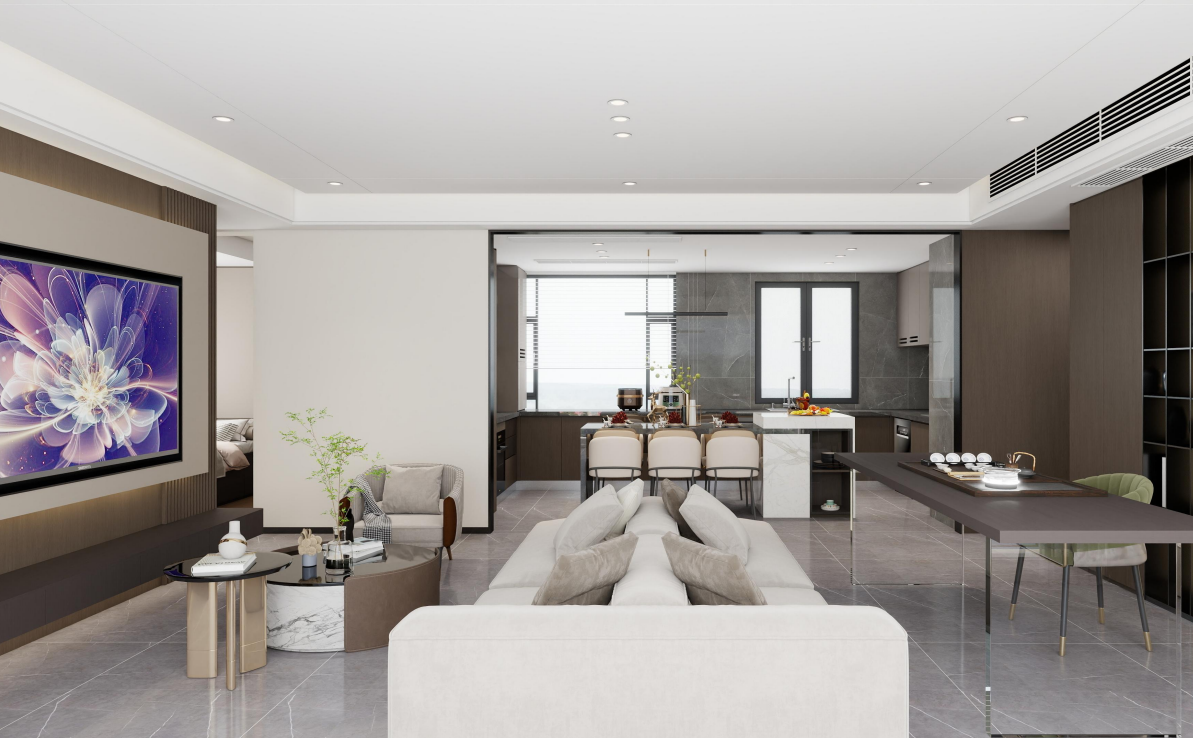 客厅:电视背景墙采用定制设计,与整体风格相呼应,增强了空间的视觉连贯性。沙发背后的布局开阔,搭配舒适的低矮沙发,营造出放松的休闲氛围。大窗户引入充足自然光,使整个客厅明亮通透。