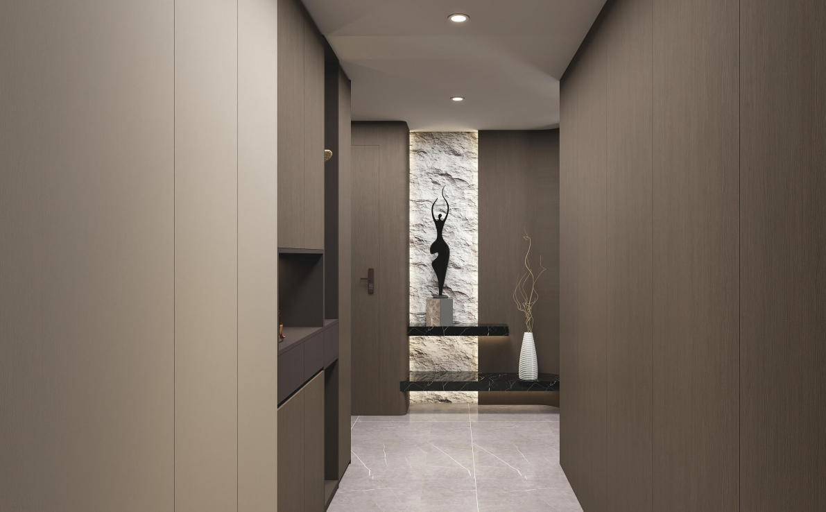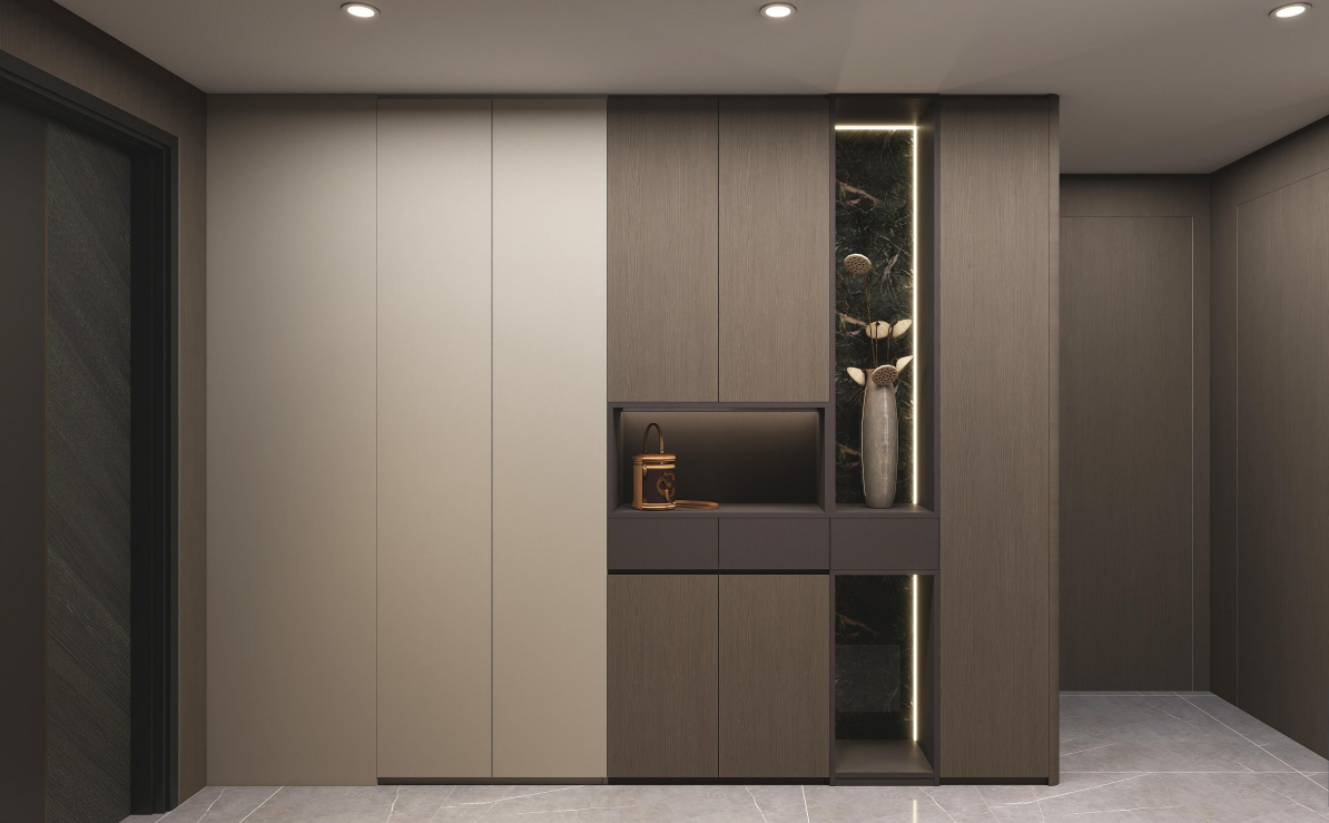 玄关处定制了大型鞋柜,满足大量鞋履的收纳需求。鞋柜设计有不同规格的分区,可放置不同高度的鞋子。部分区域设置开放格,用于摆放装饰品或常用物品,增添了玄关的实用性与美观度。背景墙的特色装饰与灯光设计,营造出温馨且具有仪式感的入户氛围,给人留下良好的第一印象。