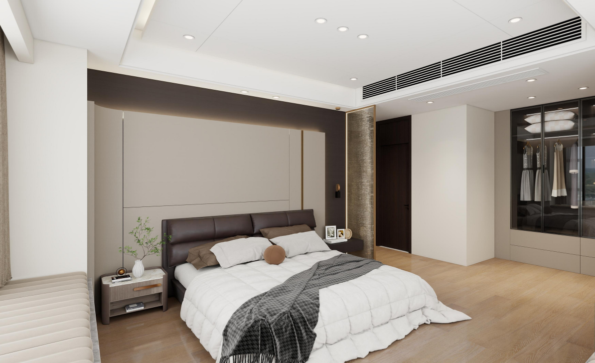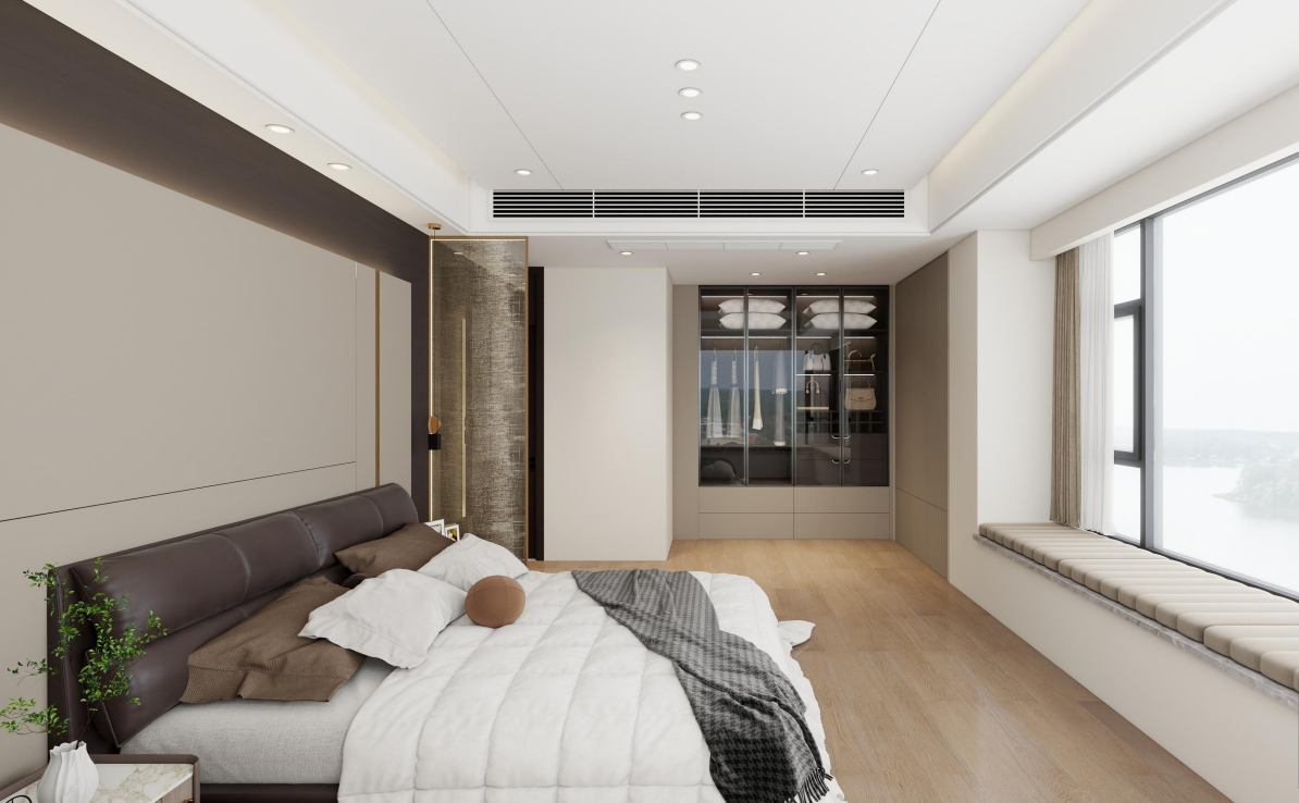 主卧定制了大型衣柜,采用玻璃与板材结合的设计,既增加了衣柜的通透感,又方便查找衣物。衣柜内部结构合理,分区明确,满足各类衣物的收纳。床头背景墙进行定制设计,搭配柔和的灯光,营造出温馨舒适的睡眠环境。床侧定制的梳妆台或书桌,为业主提供了日常梳妆或办公的空间,充分利用了卧室的每一寸空间,提升了生活的便利性。