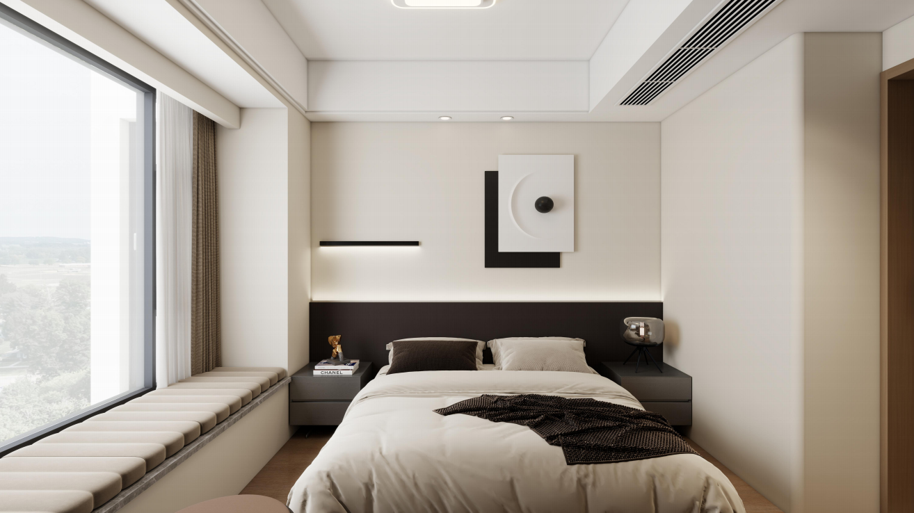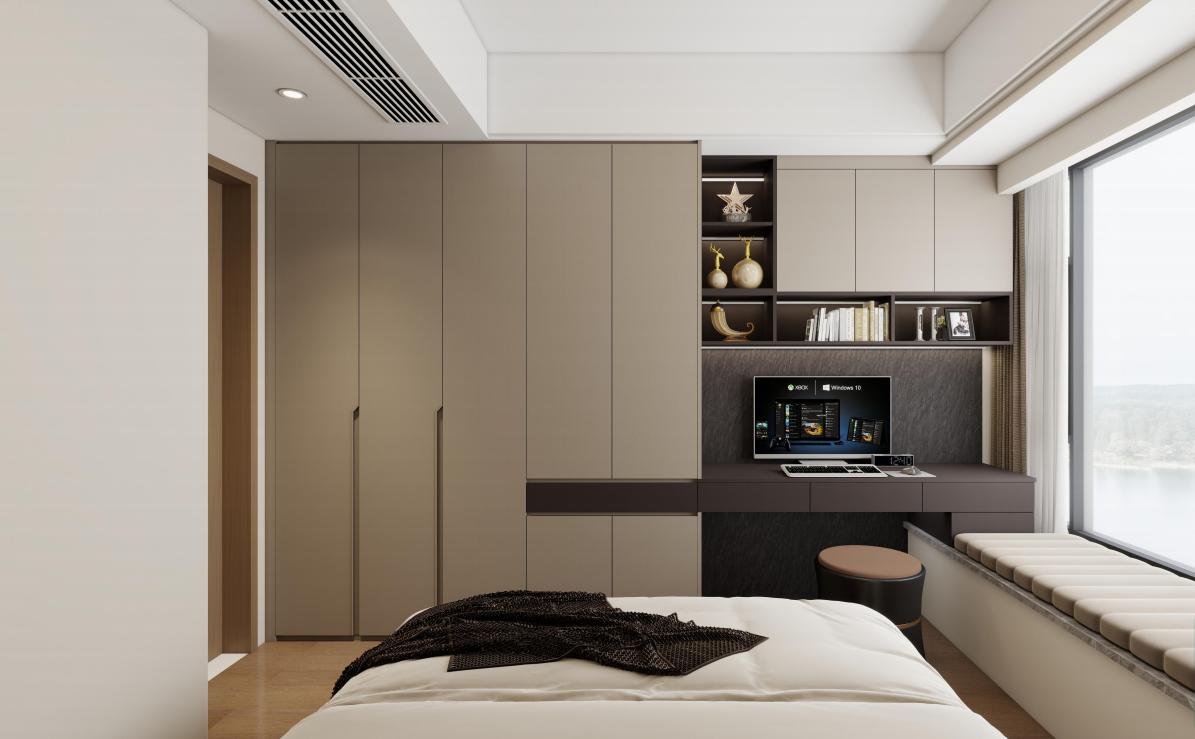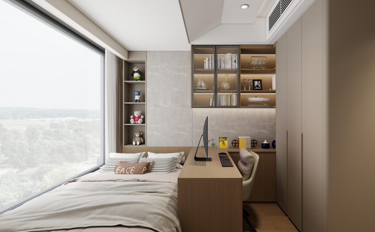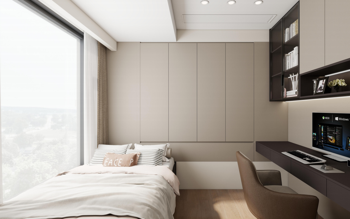 次卧一:定制的一体化地台与衣柜相连,地台可作为休闲或睡眠区域,增加了空间的多样性。书桌与衣柜定制成一体,节省空间且功能齐全,适合作为书房或客房使用。大面积的窗户保证了良好的采光,使次卧显得宽敞明亮。