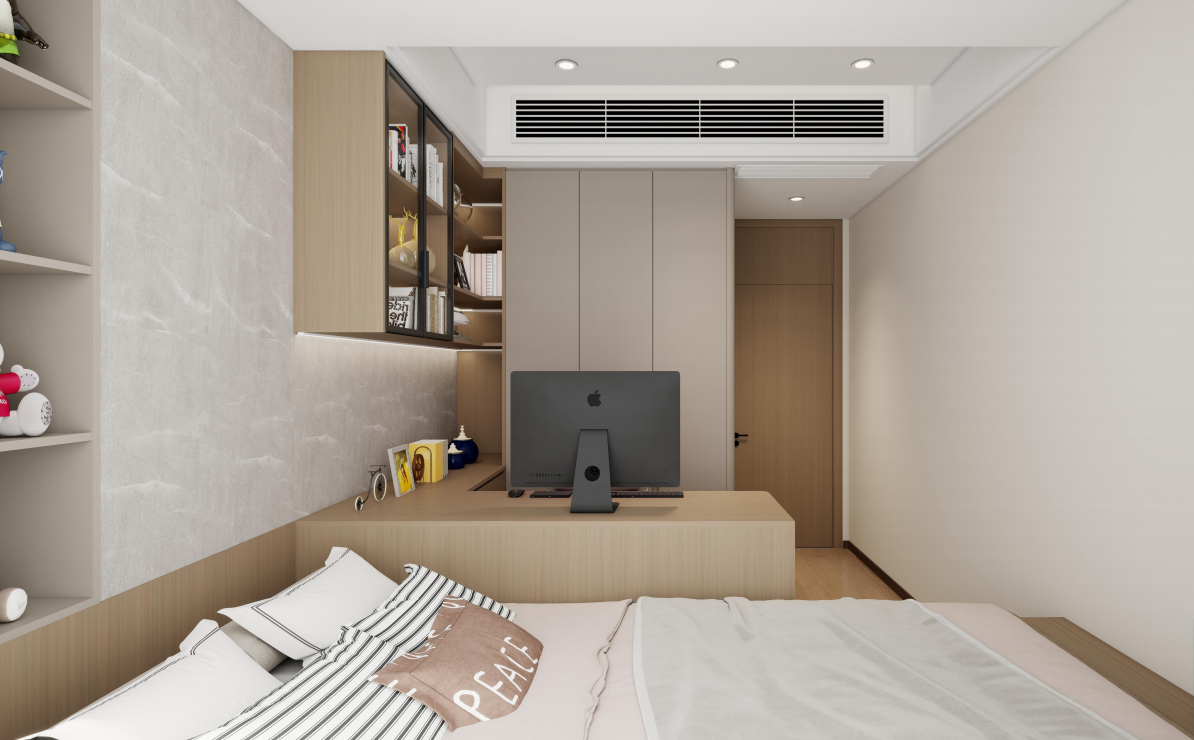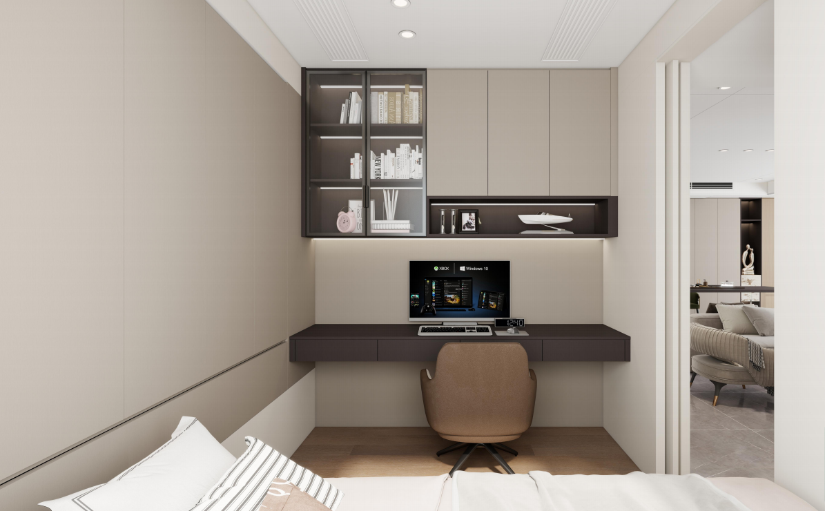次卧二:榻榻米定制设计是该次卧的亮点,提供了大量的收纳空间,同时榻榻米可作为睡眠或休闲区域。旁边的定制书桌与书架,满足了学习与工作的需求。整体设计紧凑实用,尤其适合儿童房或小型客房,充分利用有限空间,实现多种功能。