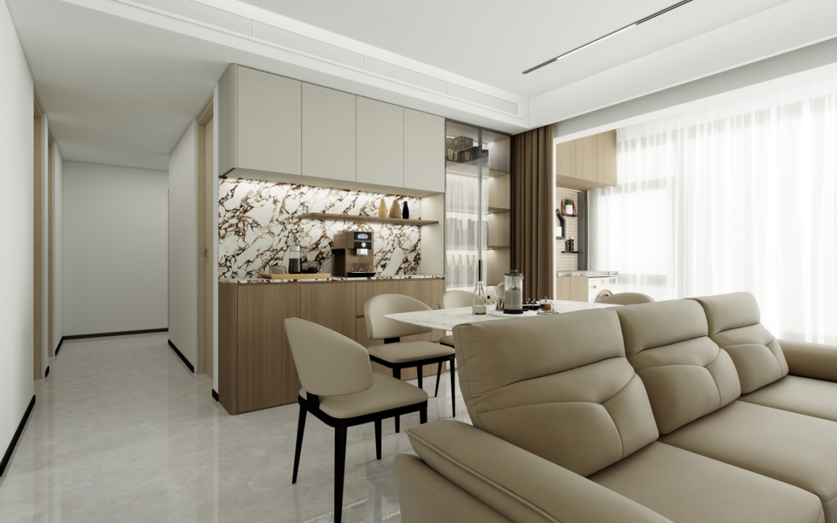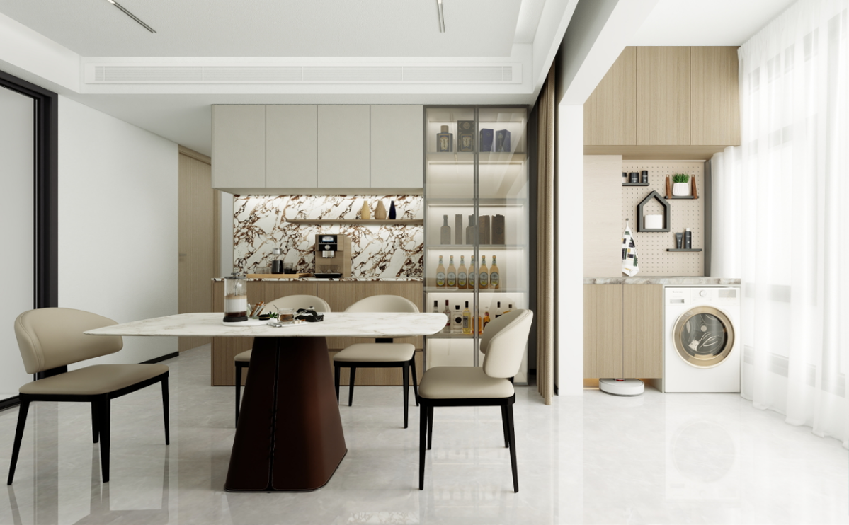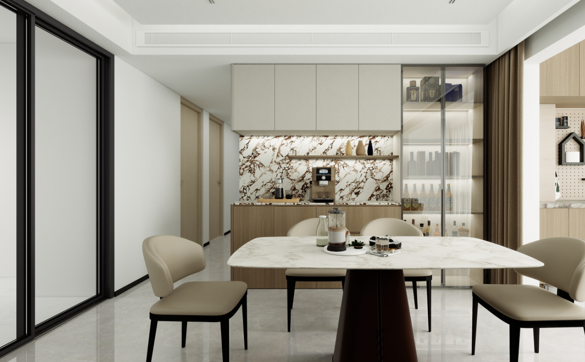 餐厅区域:餐桌采用大理石台面,搭配浅色餐椅,显得干净利落。餐边柜设计巧妙,既有封闭的储物空间,又有开放的展示架,方便存放和展示各种物品。背景墙的大理石纹理与餐桌相呼应,整体协调统一。