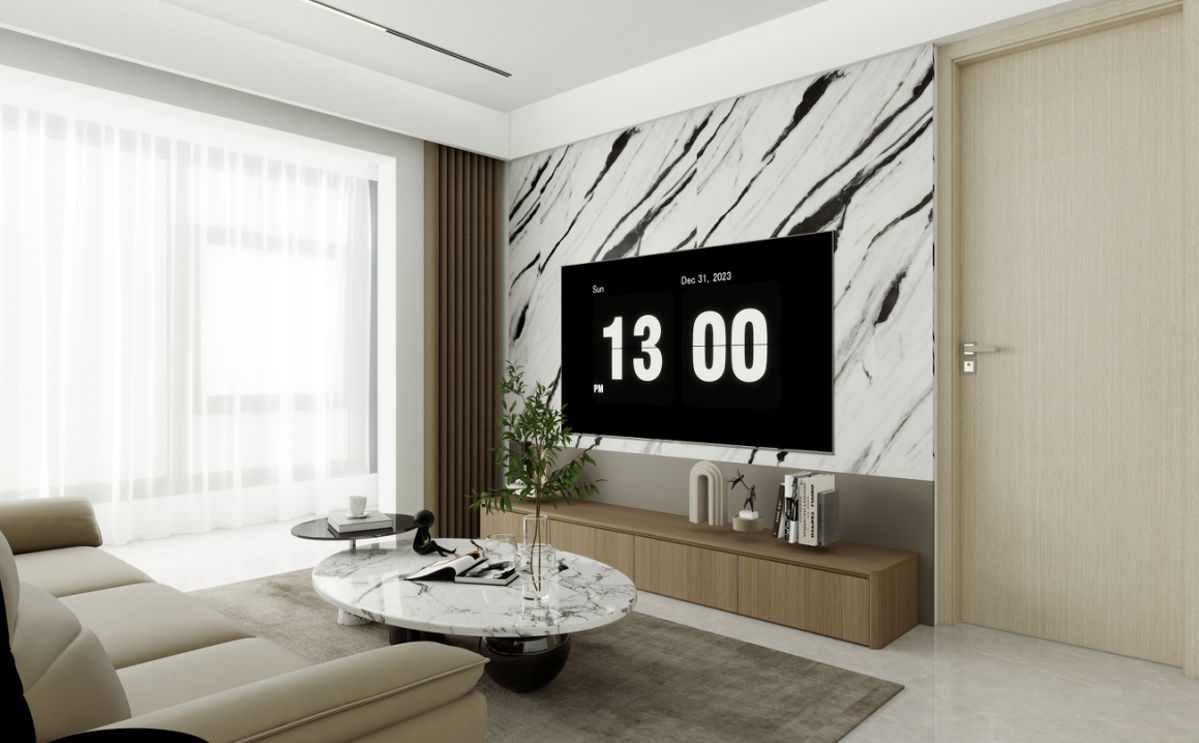 电视背景墙:采用大理石纹理的装饰材料,搭配简洁的木质电视柜,既时尚又实用。电视柜上摆放了一些装饰品和电子设备,增加了空间的层次感和功能性。