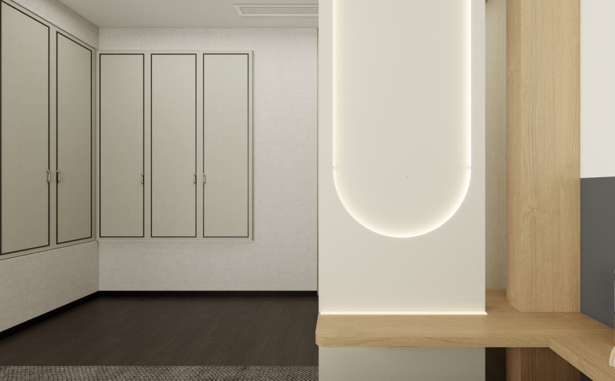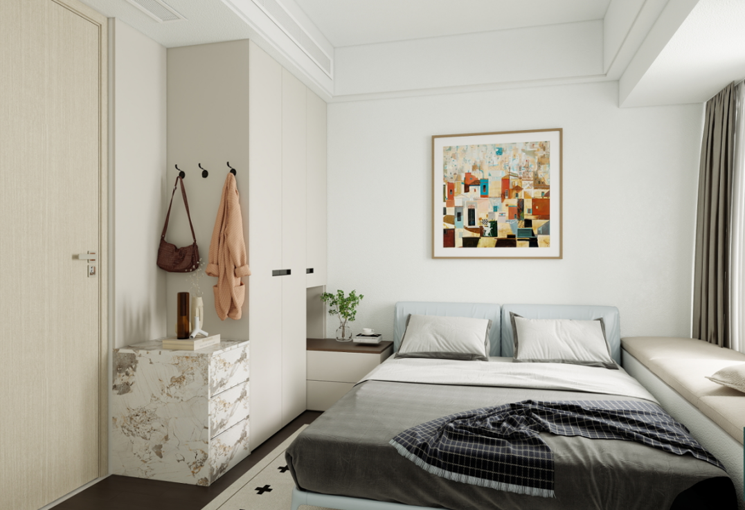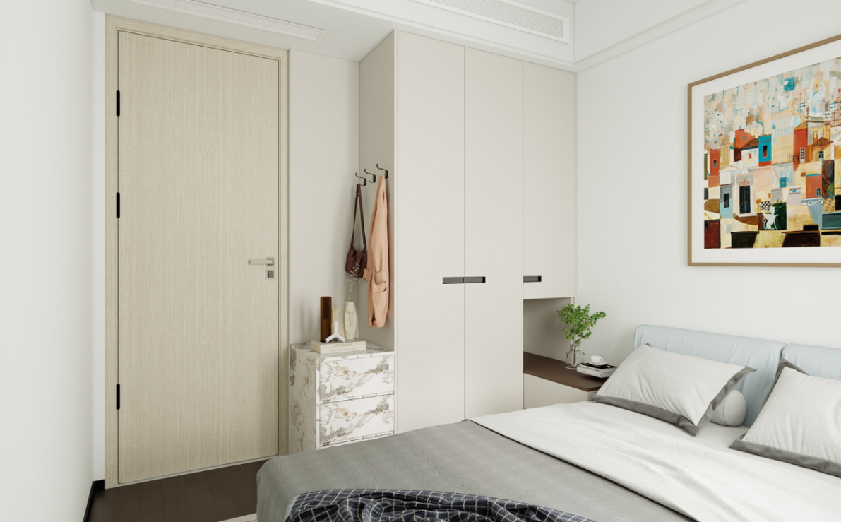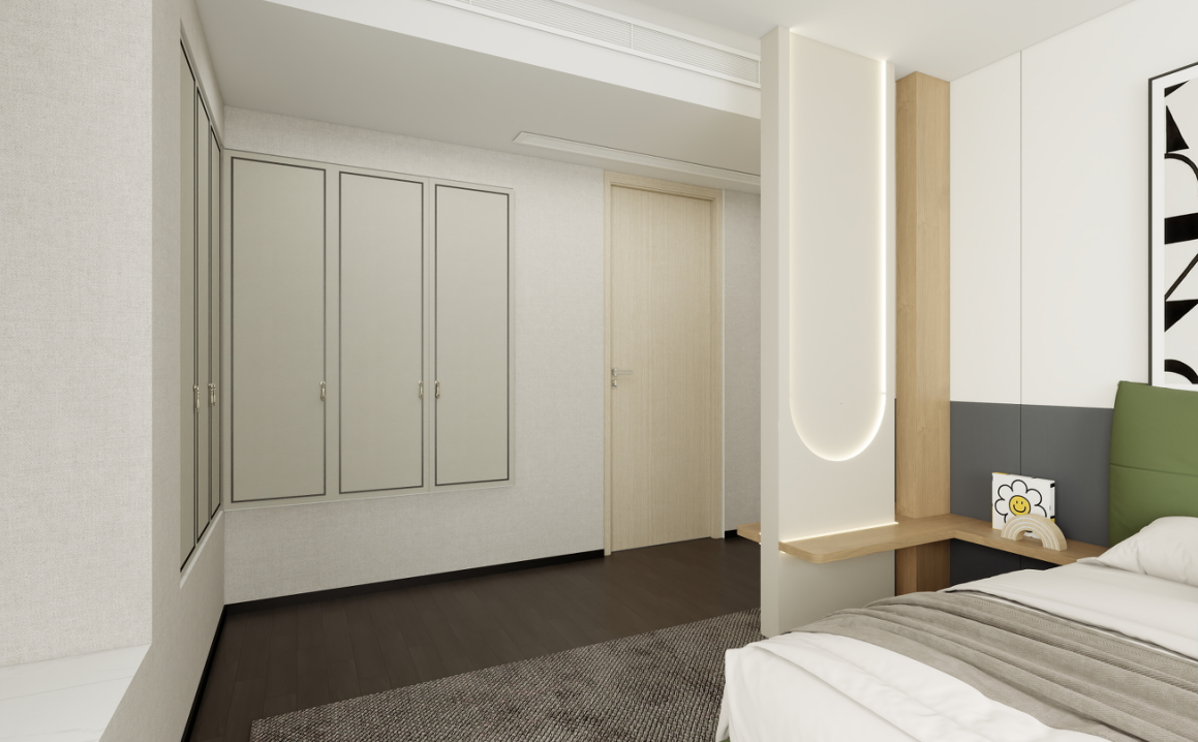 衣柜:定制的到顶衣柜提供了充足的储物空间,浅灰色的柜门简洁大方,与房间整体风格相契合。