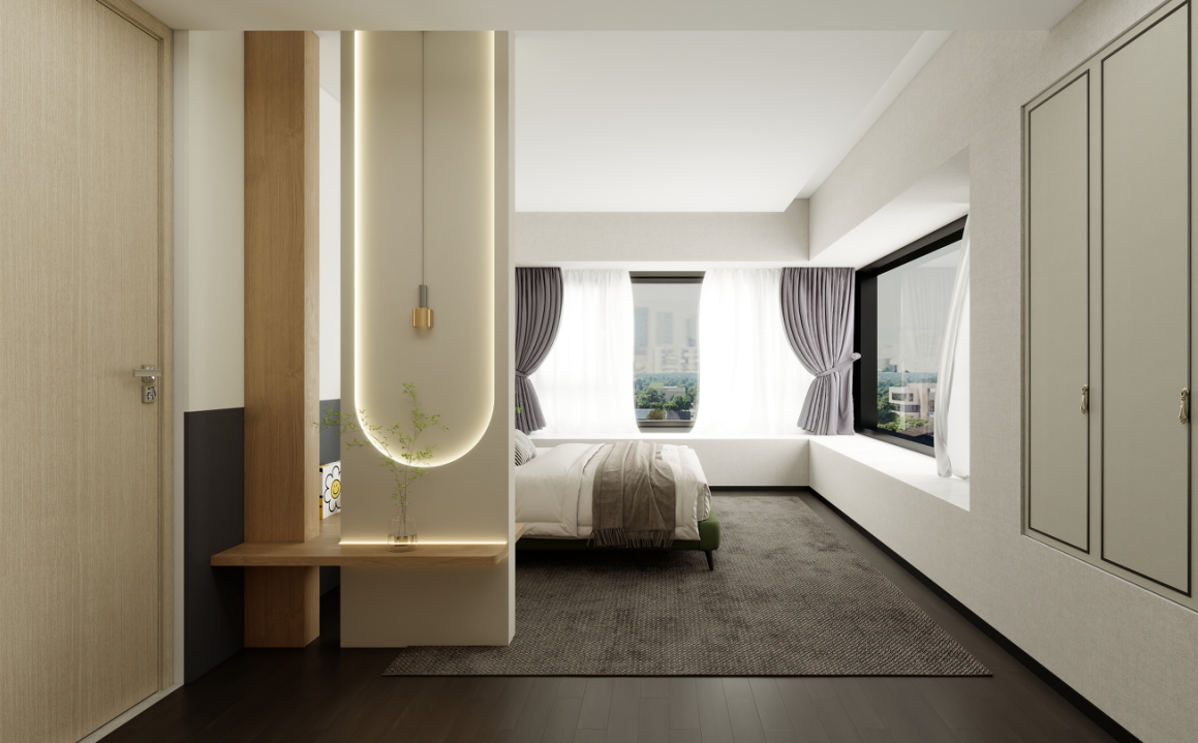 隔断设计:床与门之间的隔断设计独特,不仅起到了分隔空间的作用,还增加了房间的层次感和美观度。