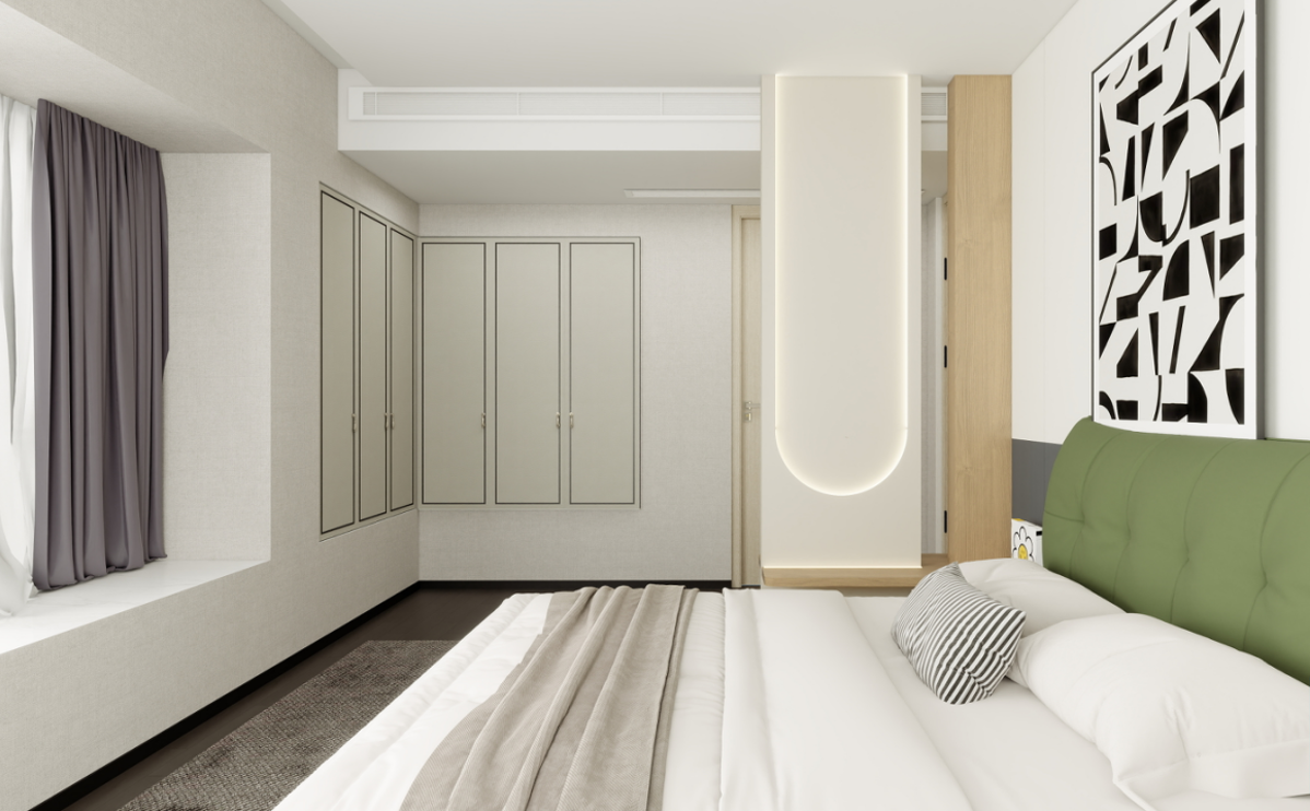 床品与色彩:白色的床品搭配浅灰色的窗帘,营造出宁静、放松的睡眠环境。绿色的床头板为空间增添了一抹亮色,提升了整体的活力。