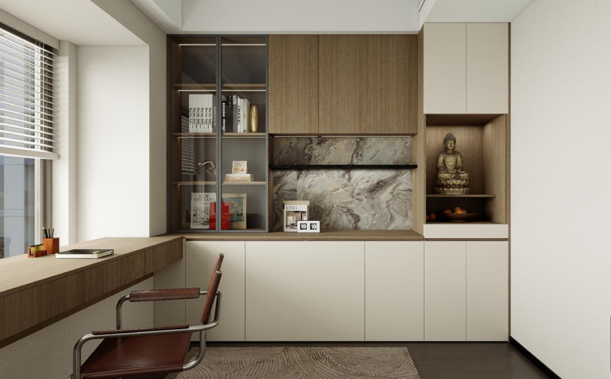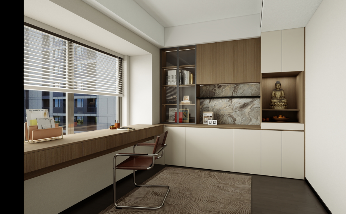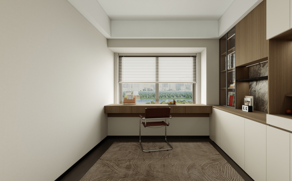 书桌与书架:靠窗定制的长书桌提供了充足的工作和学习空间,搭配舒适的椅子,适合长时间使用。书架采用开放式与封闭式相结合的设计,方便存放和展示书籍、装饰品等。
