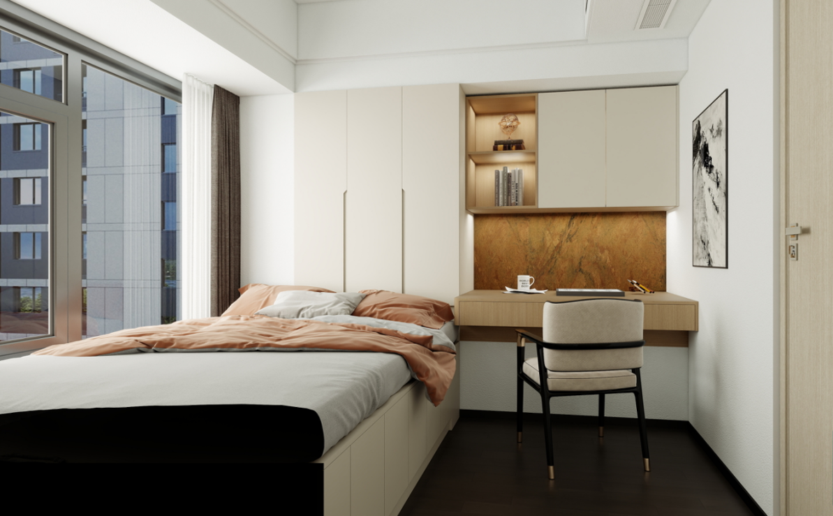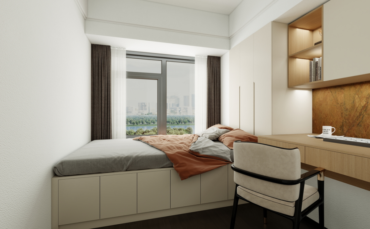 榻榻米与书桌:定制的榻榻米床兼具睡眠和储物功能,床头的书桌与衣柜相连,形成了一个高效的学习和储物空间。