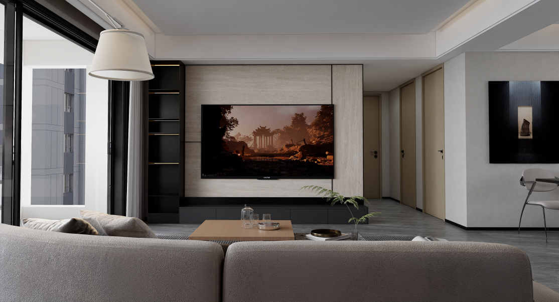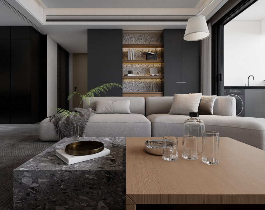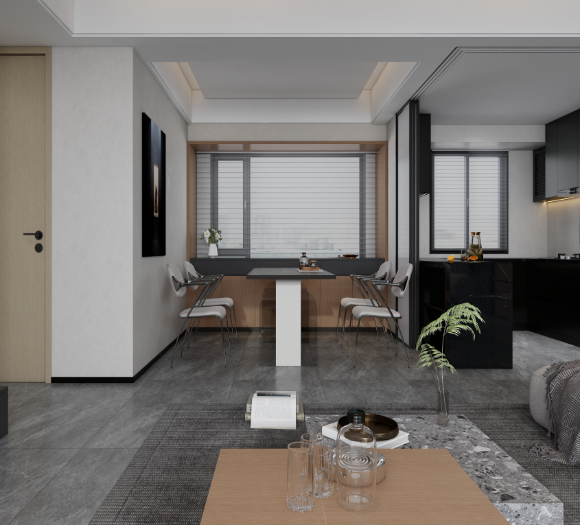 客厅采用开放式设计,与餐厅和厨房相连,沙发背景墙设计了深灰色的定制柜体,中间部分采用开放式设计,内置暖黄色灯带,既增加了空间的层次感,又提供了展示和收纳的功能。柜体的材质和颜色与整体风格相协调,显得简洁大方,电视背景墙采用浅色石材与黑色柜体相结合的设计