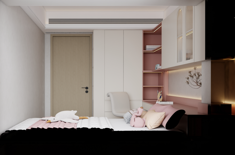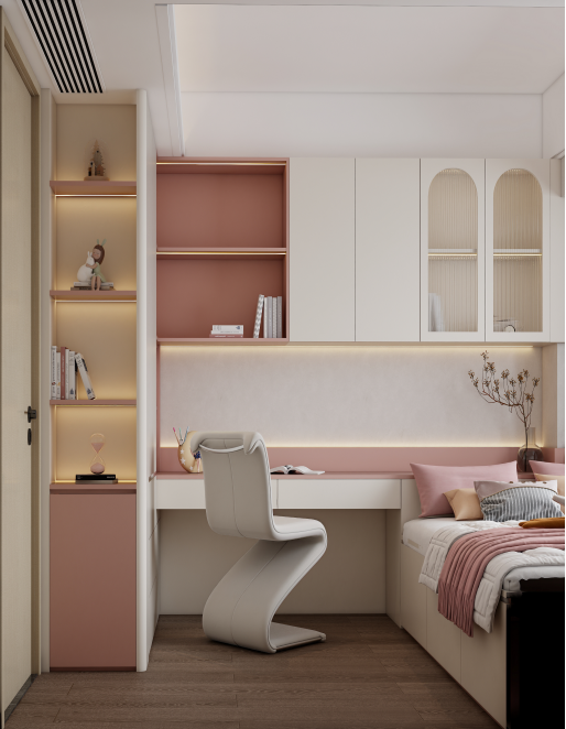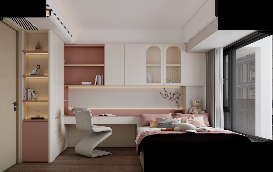 榻榻米与书桌一体设计:儿童房采用了榻榻米与书桌一体的定制设计,充分利用了空间。榻榻米下方设有收纳抽屉,可以存放衣物和杂物。书桌与书架相连,提供了学习和收纳的空间。