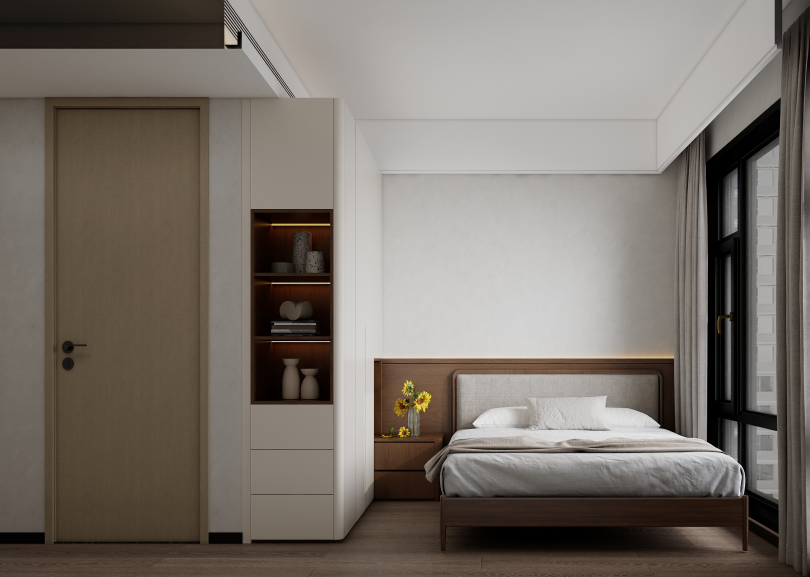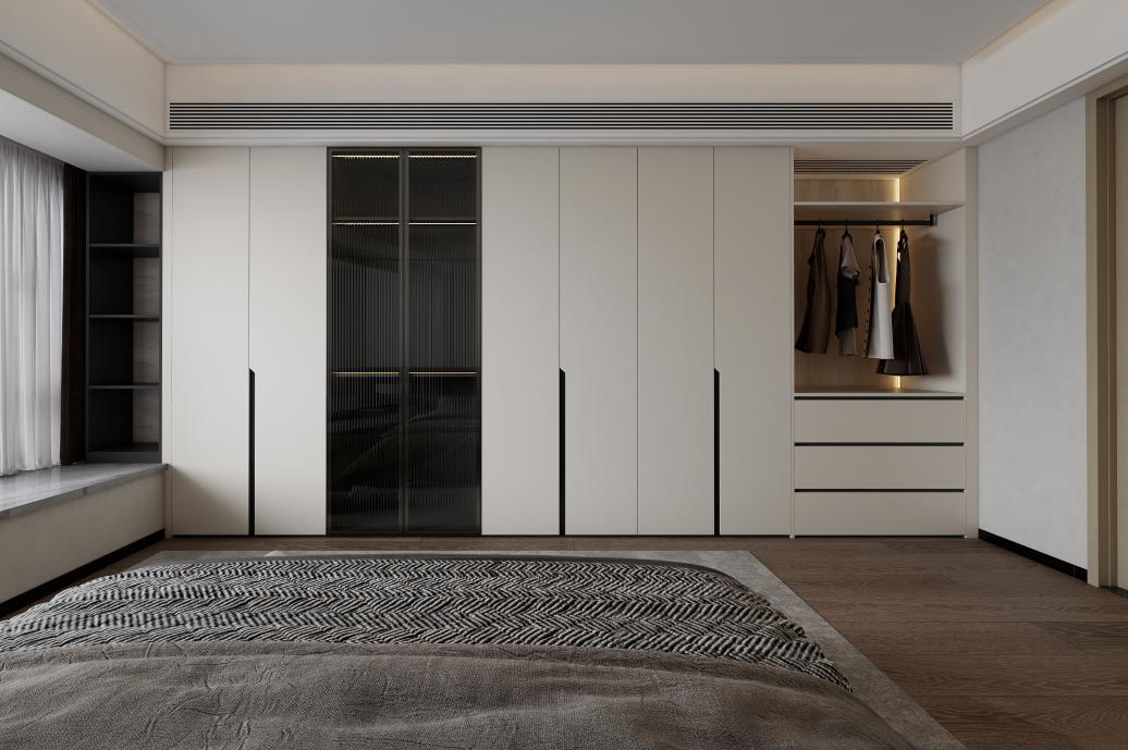 主卧的设计简约大方,以浅色为主色调,搭配木质地板,营造出温馨舒适的睡眠环境。卧室一侧设计了到顶的定制衣柜,提供了充足的衣物收纳空间,衣柜的外观设计简洁,与整体风格相统一,部分区域采用玻璃柜门,增加了空间的通透感。