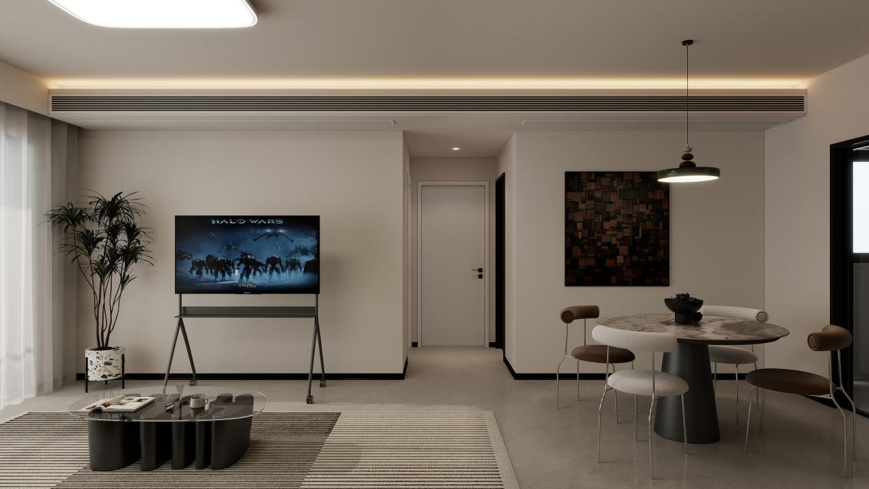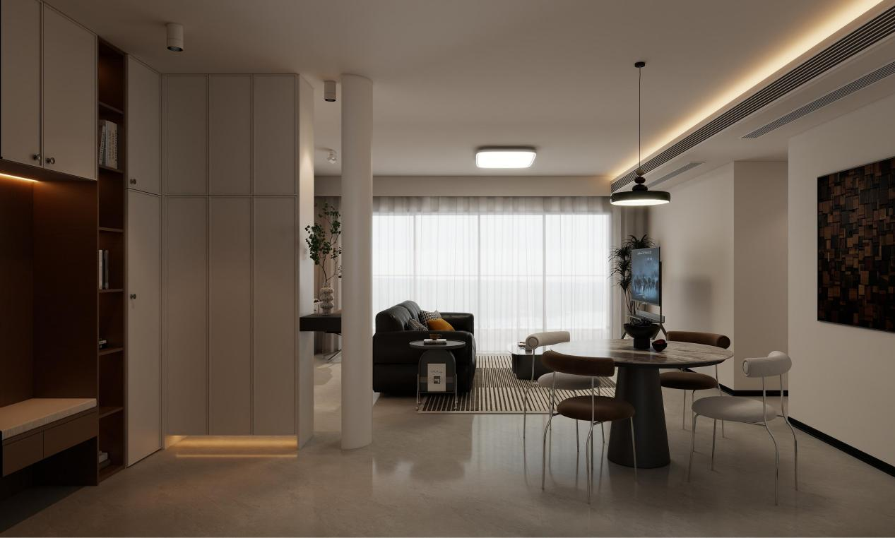客厅布局开阔,黑色皮质沙发搭配圆形大理石纹餐桌,既时尚又实用。沙发背后的整墙储物柜设计,提供了充足的收纳空间,同时大理石纹的装饰部分增添了视觉层次感。采用无主灯设计,方形天花板灯和吊灯提供基础照明,搭配局部照明,营造出温馨而舒适的光环境。黑白条纹地毯、抽象装饰画和绿植等装饰元素,为空间增添了艺术感和生机。