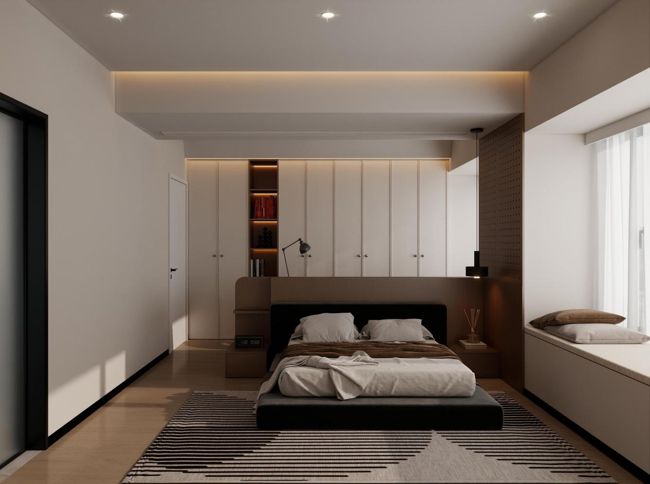 卧室色调以中性色为主,搭配木色地板和黑色家具,营造出温馨而宁静的睡眠环境。卧室布局注重功能性,床边的小圆桌和台灯方便日常使用。飘窗区域可设计为休闲区,提供额外的休息空间。整墙衣柜设计,提供了充足的衣物收纳空间,同时保持了空间的整洁和有序。