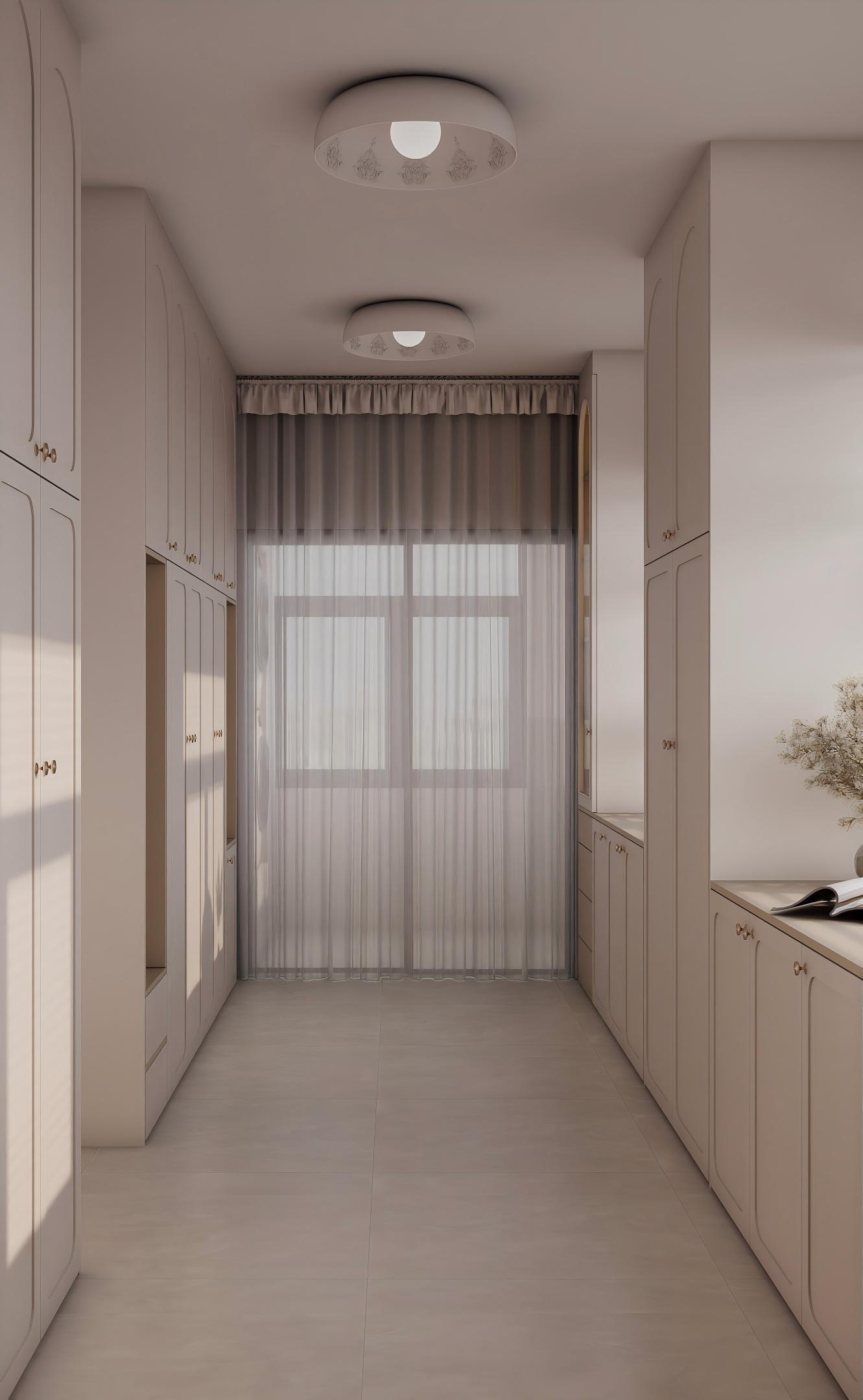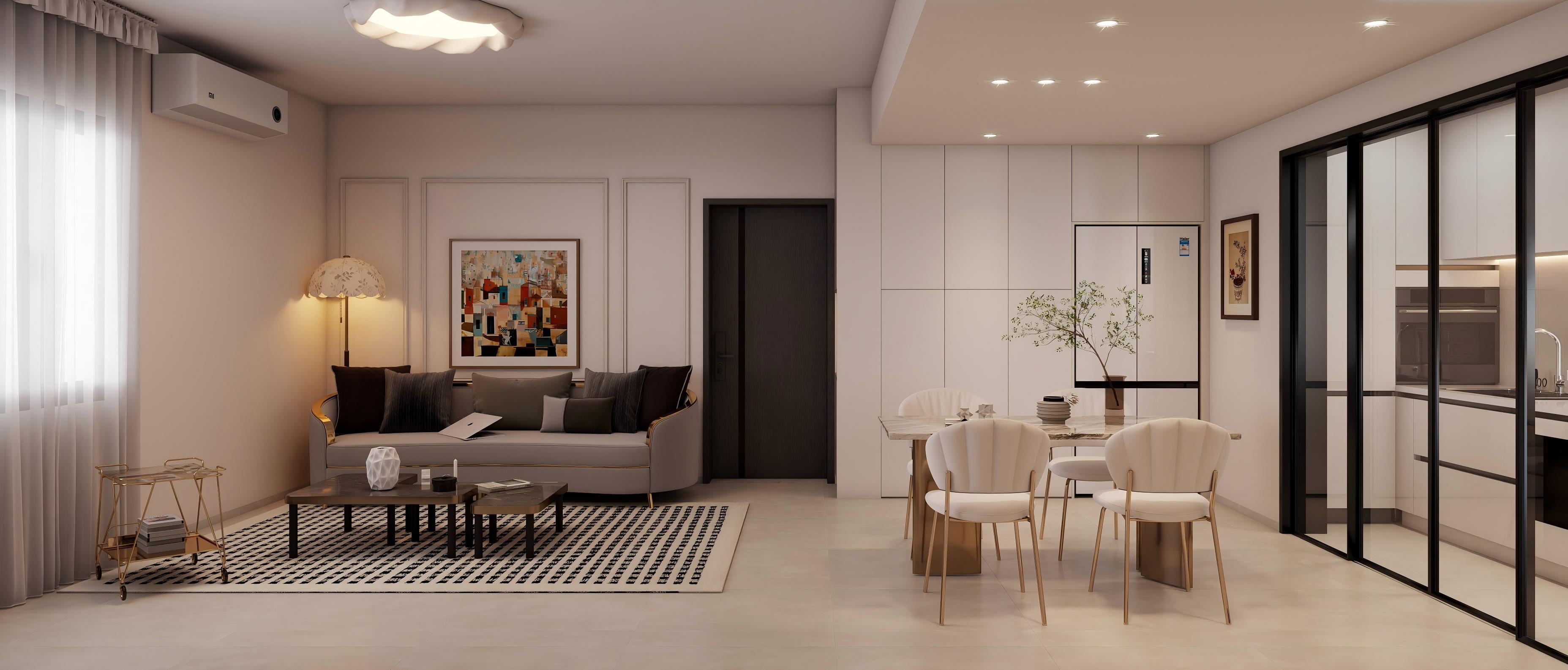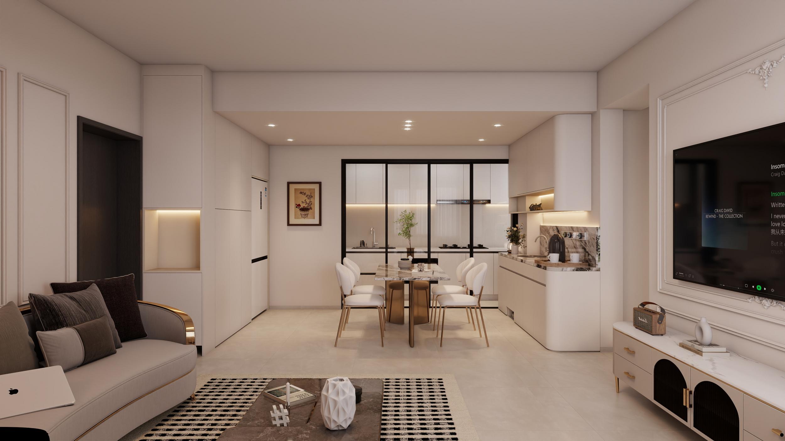 客厅布局开阔,电视背景墙采用精致的装饰线条,搭配悬挂的平板电视,下方是带有金色细节的白色电视柜,摆放着装饰品,增添了空间的艺术感。沙发选择浅灰色,搭配深棕色靠垫,形成色彩对比。黑白格纹地毯与金色框架的茶几相得益彰,沙发旁的金属边几和台灯进一步提升了轻奢质感。大窗户引入充足自然光,使空间明亮通透。