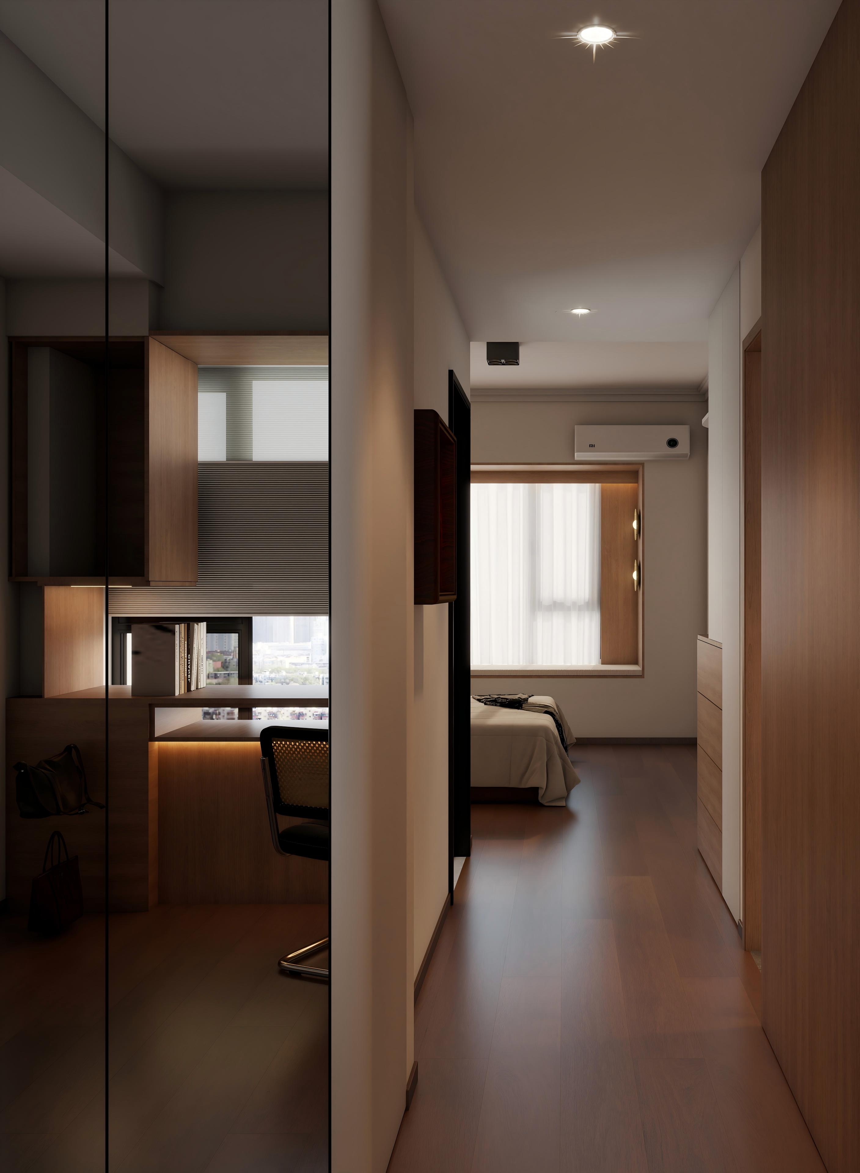 卧室注重细节处理,如床头的台灯、飘窗的软垫等,都体现了对居住者舒适体验的关注。大窗户搭配白色窗帘,保证了充足的自然光线,同时保护了隐私