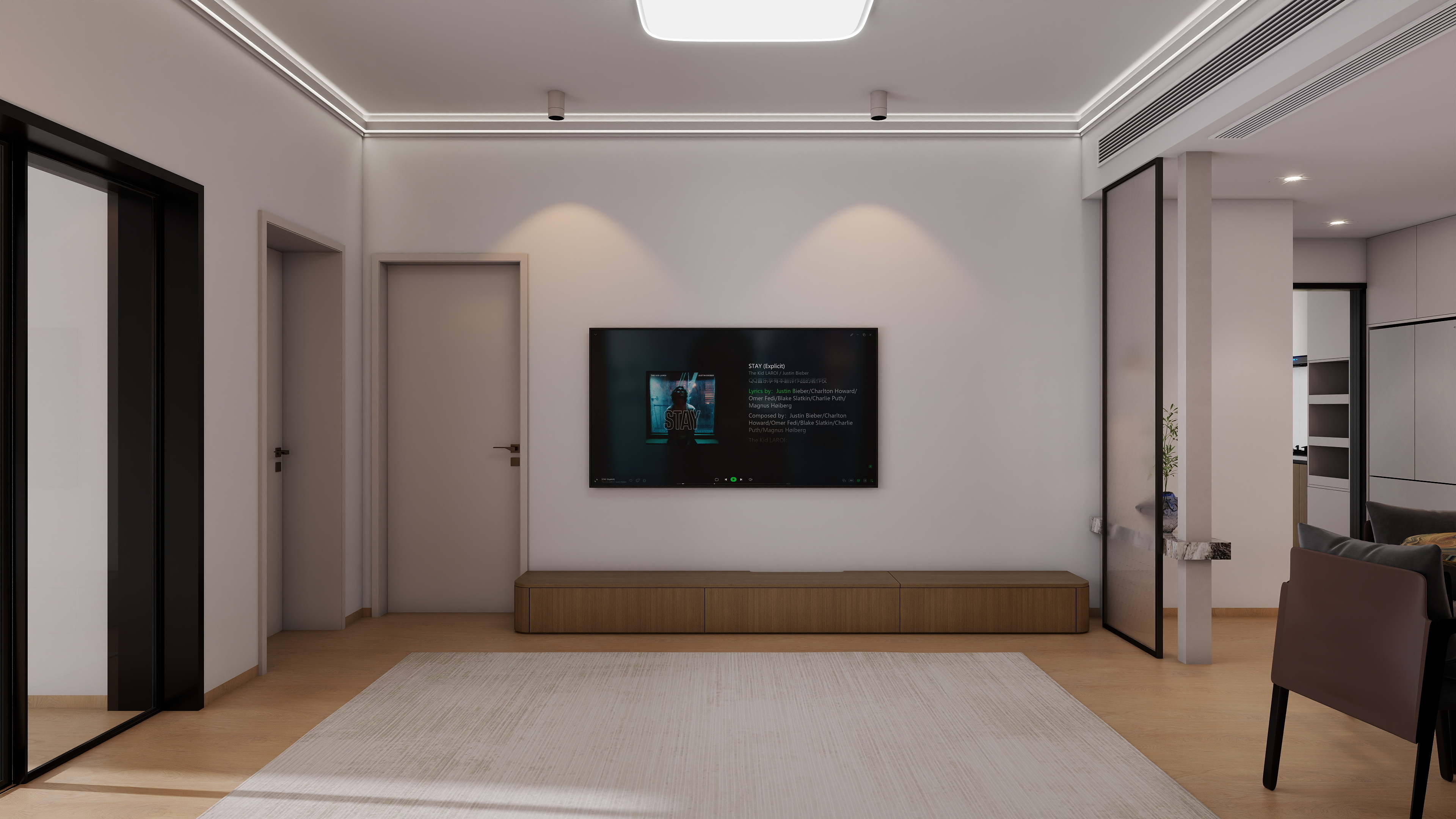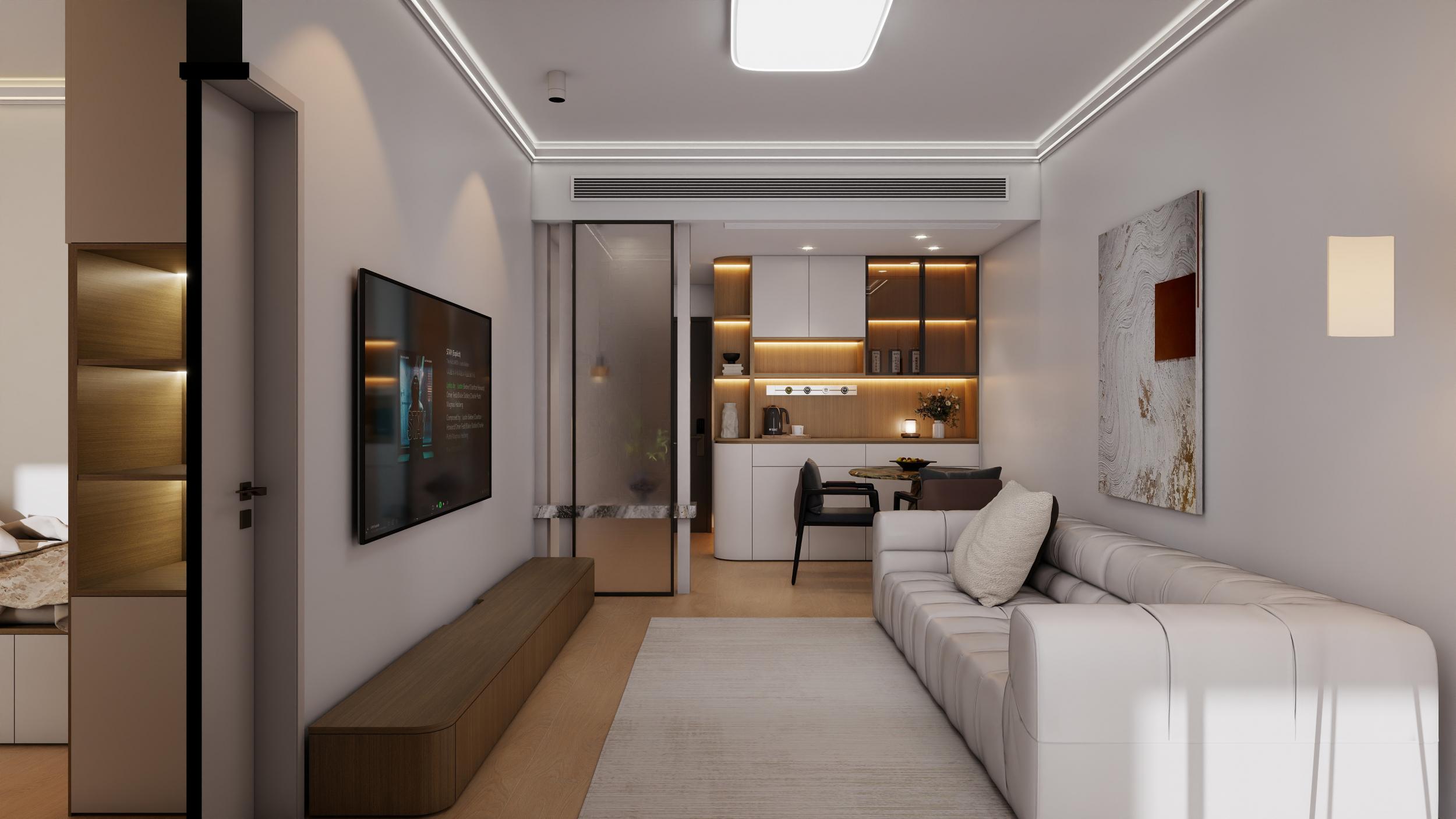 电视墙以纯白墙面+木质悬空电视柜呈现,弱化繁复感。客厅与阳台间采用玻璃隔断,引入自然光的同时保持空间连贯性;墙面抽象装饰画与落地灯提升艺术氛围。