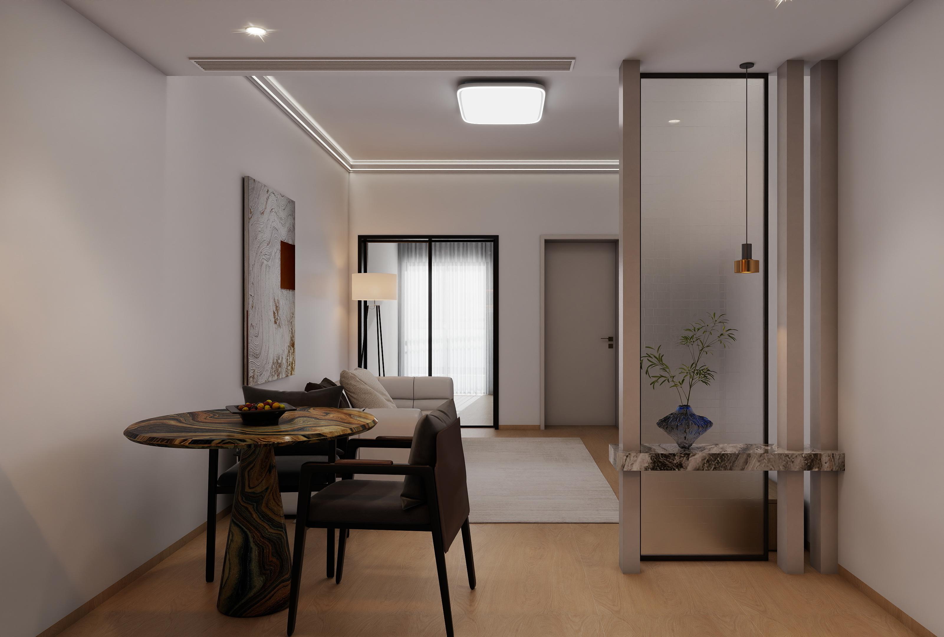 餐厅与客厅无缝衔接,圆形大理石纹理餐桌搭配深色餐椅,柔化方正空间线条,促进互动性。玄关柜与餐边柜一体化设计,封闭柜体满足收纳需求,开放格搭配灯带展示装饰品,兼具实用性与美观性。简约吊灯与绿植点缀,为用餐空间注入温馨感。