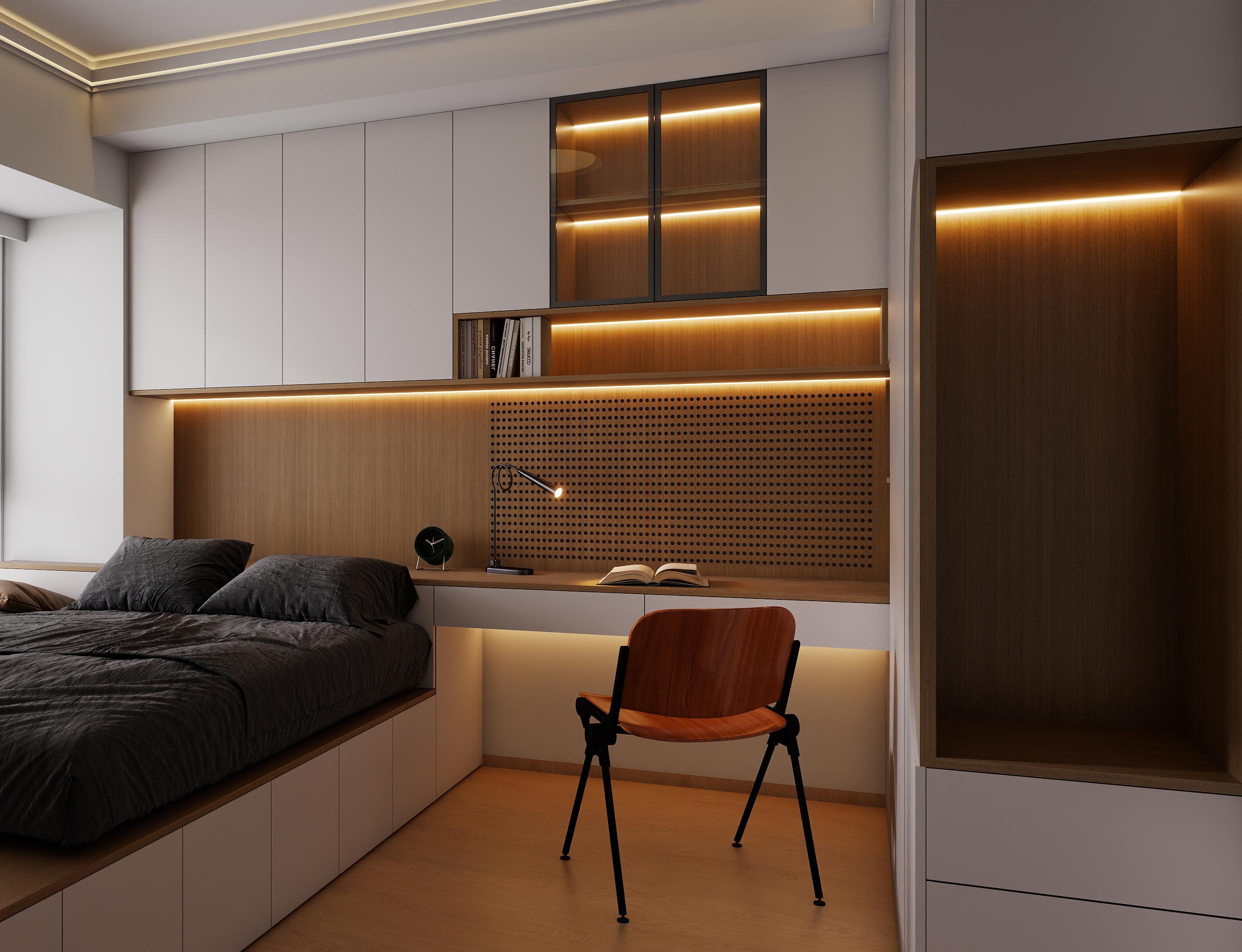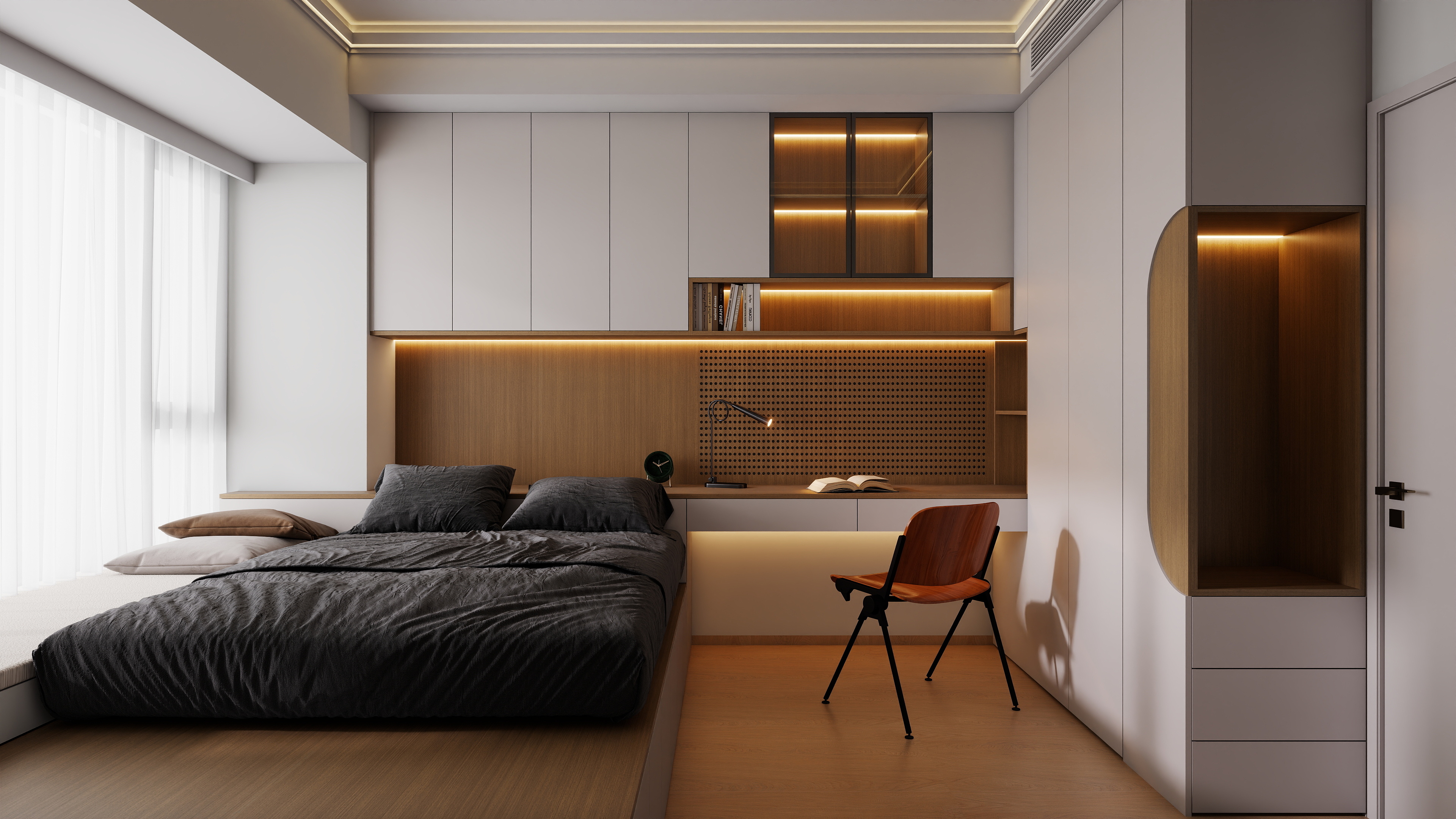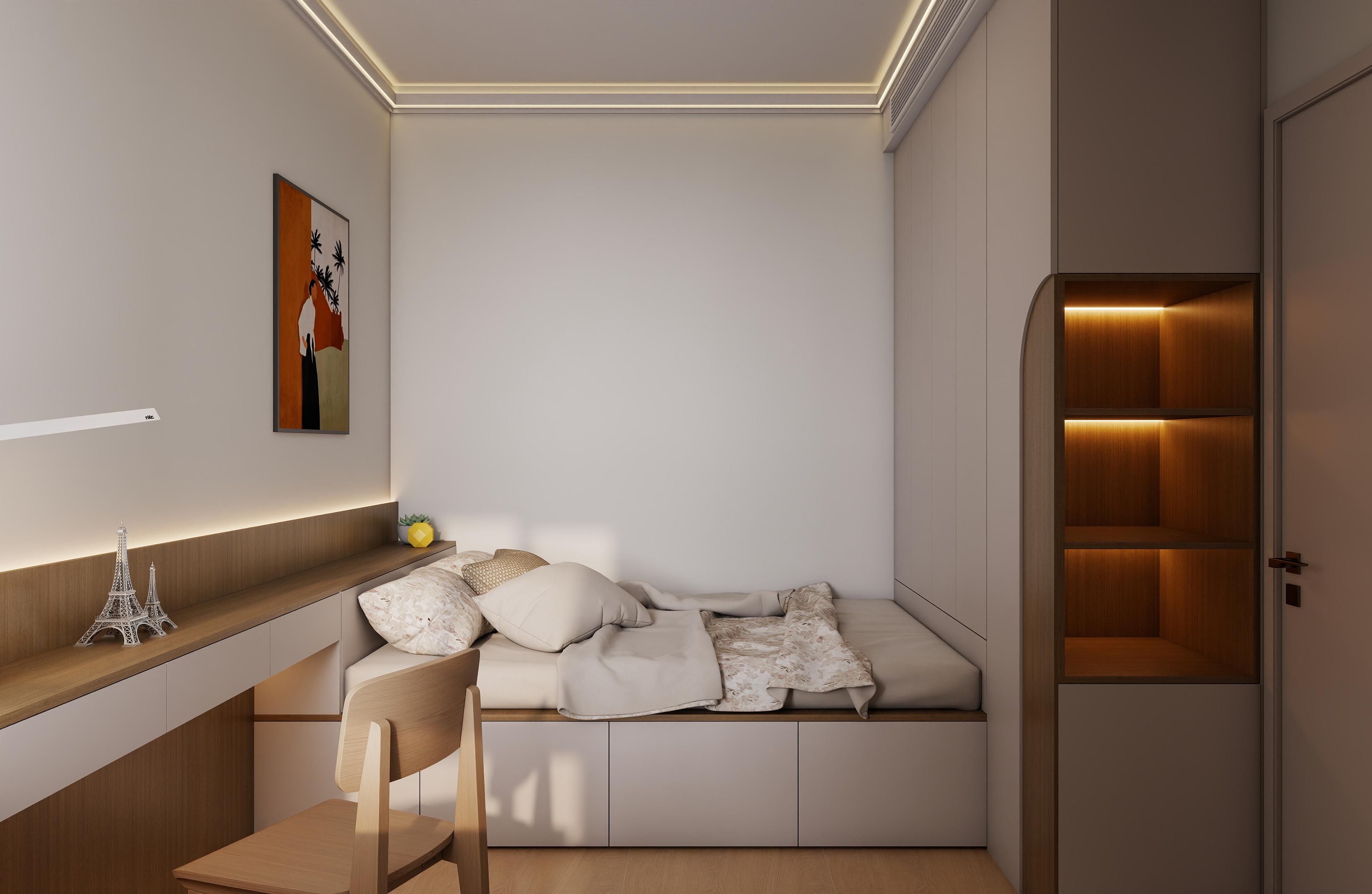 主次卧均采用榻榻米床体,下方嵌入储物抽屉,解决小空间收纳难题;床头延伸书桌/柜体,实现睡眠、工作、储物多功能整合 床头隐藏式灯带提供柔和照明,避免刺眼直光,营造放松休憩环境。白色柜体+木饰面护墙板,搭配浅色床品,延续整体简约风格;局部暖色调灯带增添温馨感。
