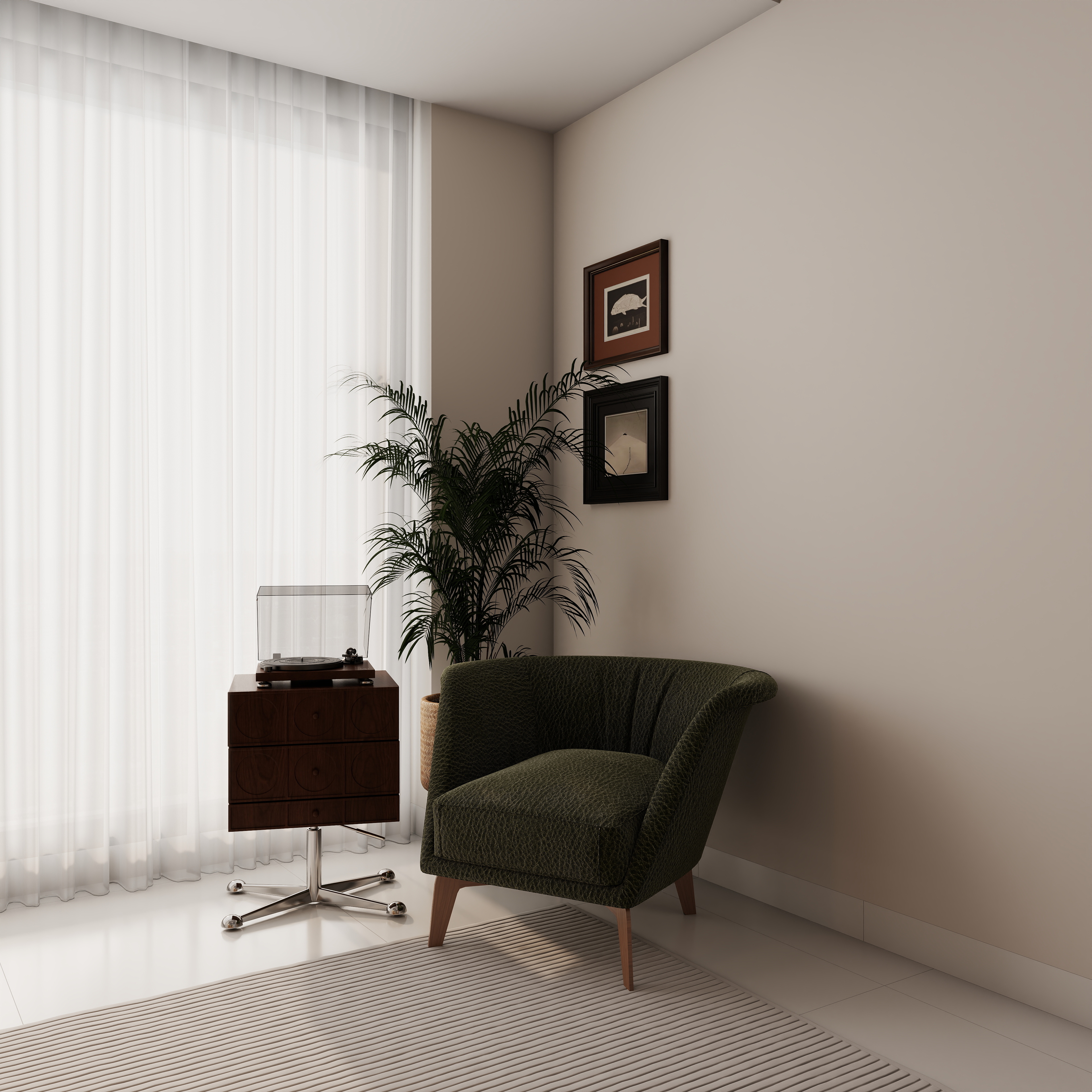 客厅:以米白、浅木色为主,搭配哑光皮质沙发和木质茶几,营造温暖柔和的氛围。墙面采用硬包拼接设计,增加空间层次感。无主灯设计(嵌入式灯带+筒灯)提供均匀照明,落地灯作为局部补光,增强温馨感。电视墙整合收纳柜与展示格,兼顾实用性与美观;沙发与单椅形成围合式对话空间,促进互动。