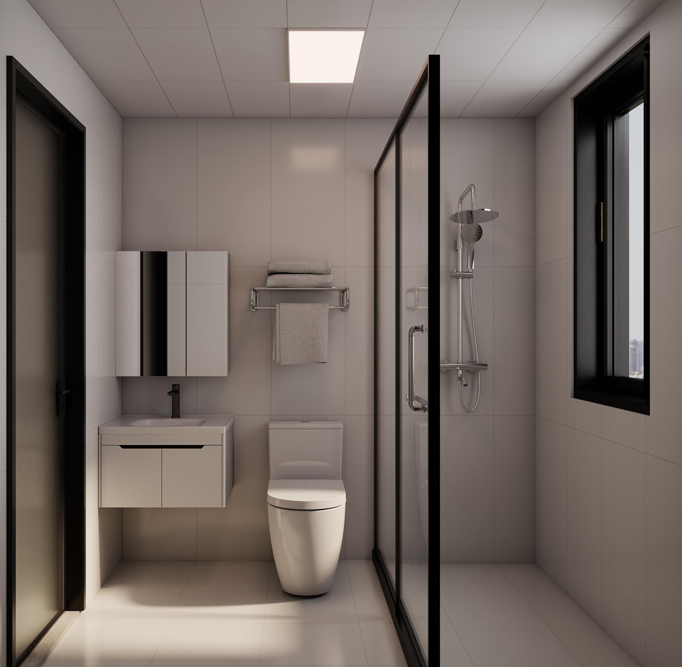 卫生间:玻璃淋浴房实现干湿分区,黑色五金件提升质感。镜柜内置照明,增加储物空间;壁龛设计方便放置洗浴用品。白色瓷砖通铺,简洁易清洁;黑色边框与五金件形成视觉对比,现代感十足。