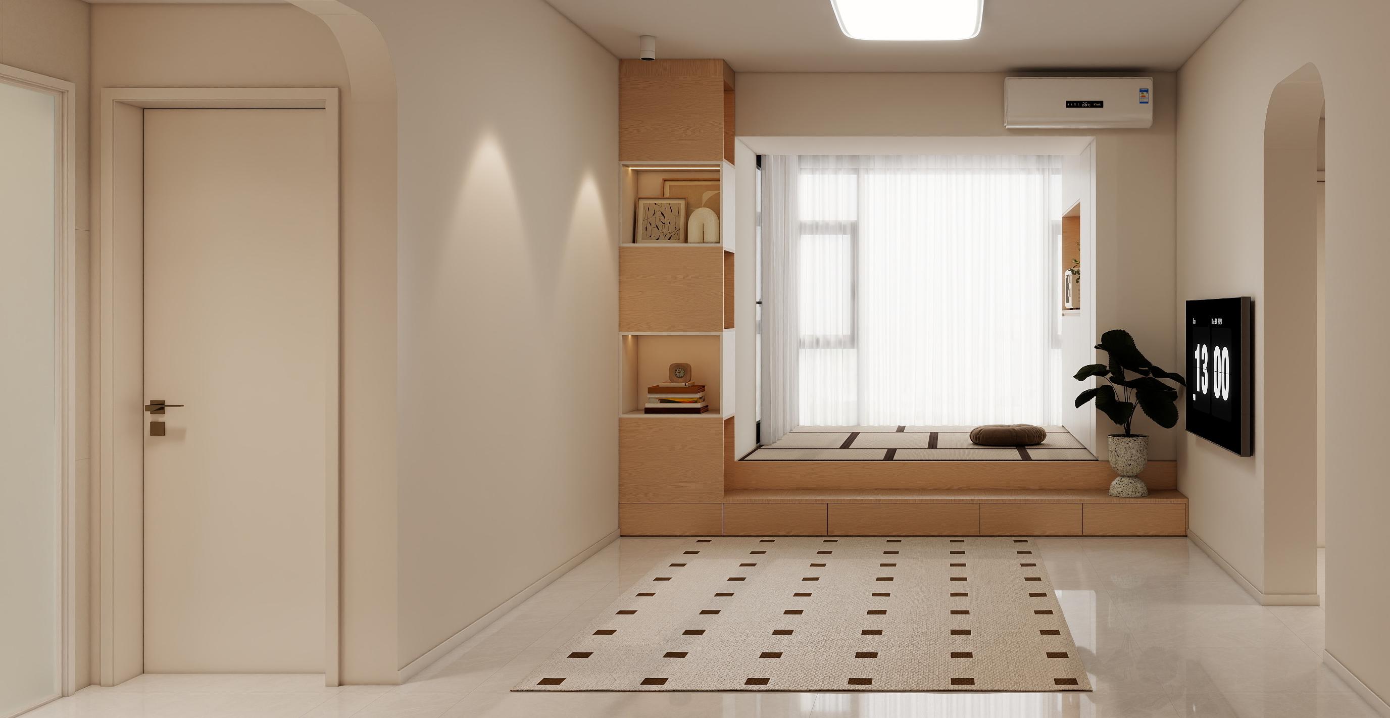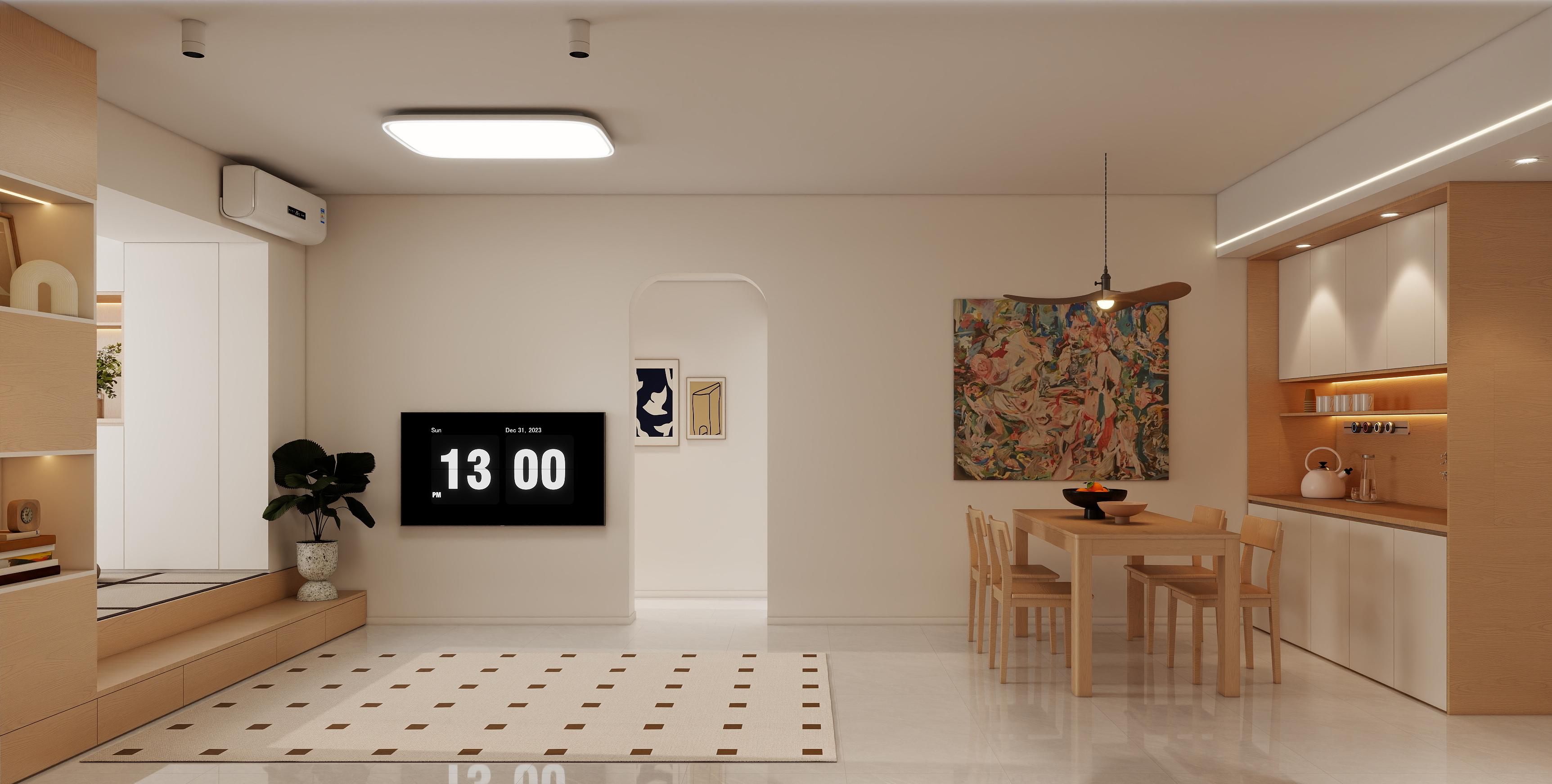 客厅:采用LDK一体化设计,客厅、餐厅、厨房联动,打破空间隔阂,增强采光与互动性。浅色瓷砖通铺地面,反射光线使空间更显宽敞。米色布艺沙发搭配木质茶几,柔和的曲线与自然材质营造温暖氛围;吊扇灯兼具实用性与复古情调。无主灯布局,提供均匀照明,重点区域如书架、装饰画,通过局部灯光突出层次感。电视墙整合开放式书架与封闭储物柜,兼顾展示与收纳需求;装饰画与绿植点缀空间,增添生活气息。