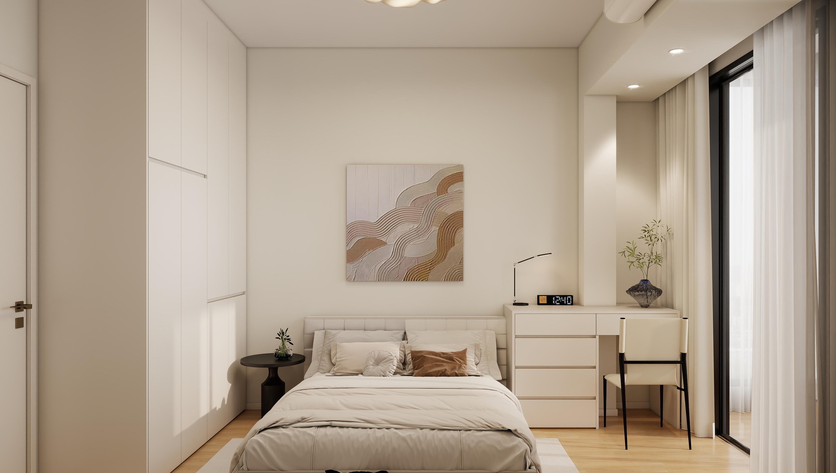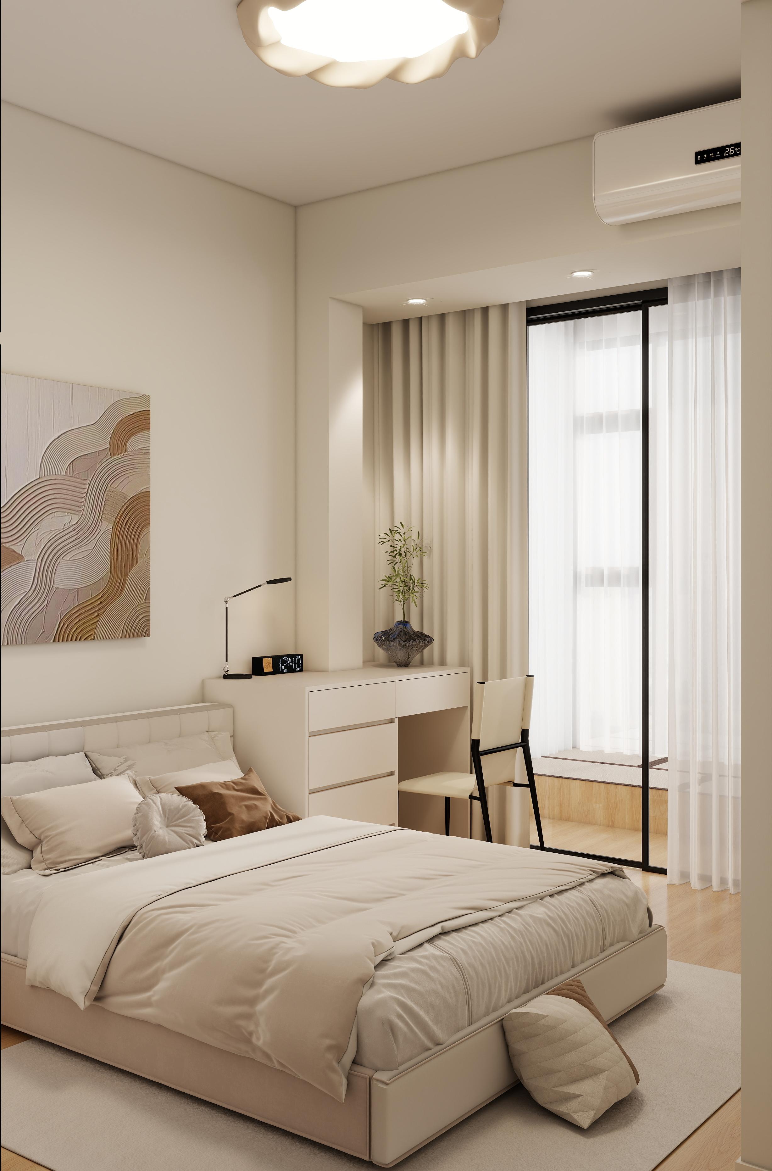 卧室:米白、浅木色为主,搭配哑光质感的床品与家具,营造宁静氛围。床头抽象装饰画与简约吊灯提升艺术感。定制通顶衣柜满足衣物收纳,床头一侧设置梳妆台/书桌,结合飘窗区域优化空间利用率。浅色纱帘过滤强光,保证隐私的同时保持通透感。