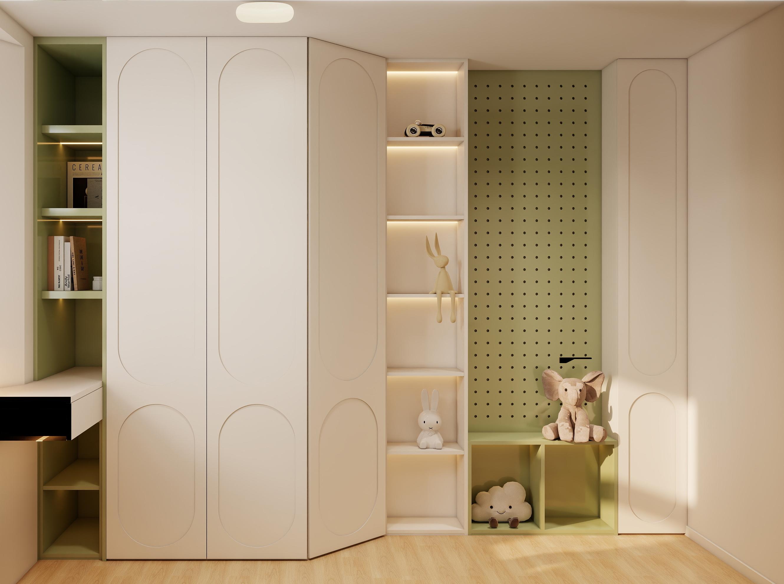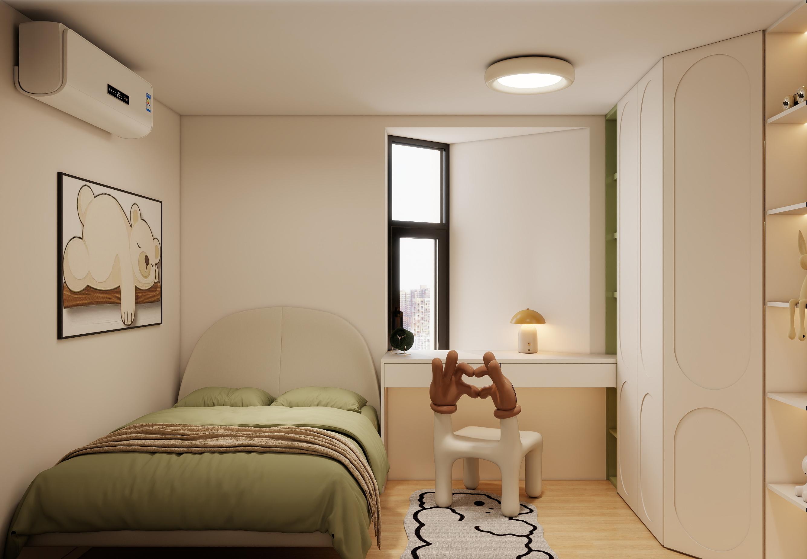 儿童房:以柔和的米绿基调为主,搭配卡通元素,打造童趣氛围。定制书桌靠窗布置,充分利用自然光线;趣味造型家具,激发孩子想象力。衣柜内部设计开放式搁架与洞洞板,方便收纳玩具与书籍,适应成长需求。