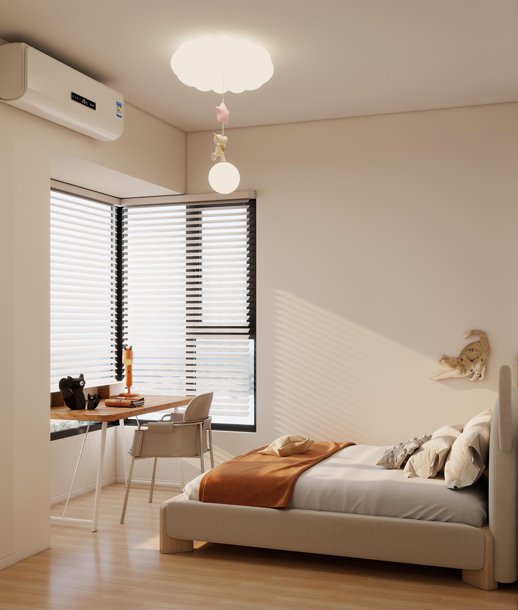 儿童房:床、书桌与装饰元素紧凑排列,小户型最大化利用有限空间。墙面装饰与吊灯利用垂直空间,避免地面拥挤,保持通透感,天花板悬挂云朵造型灯具,搭配星星、动物挂饰,营造童趣氛围。