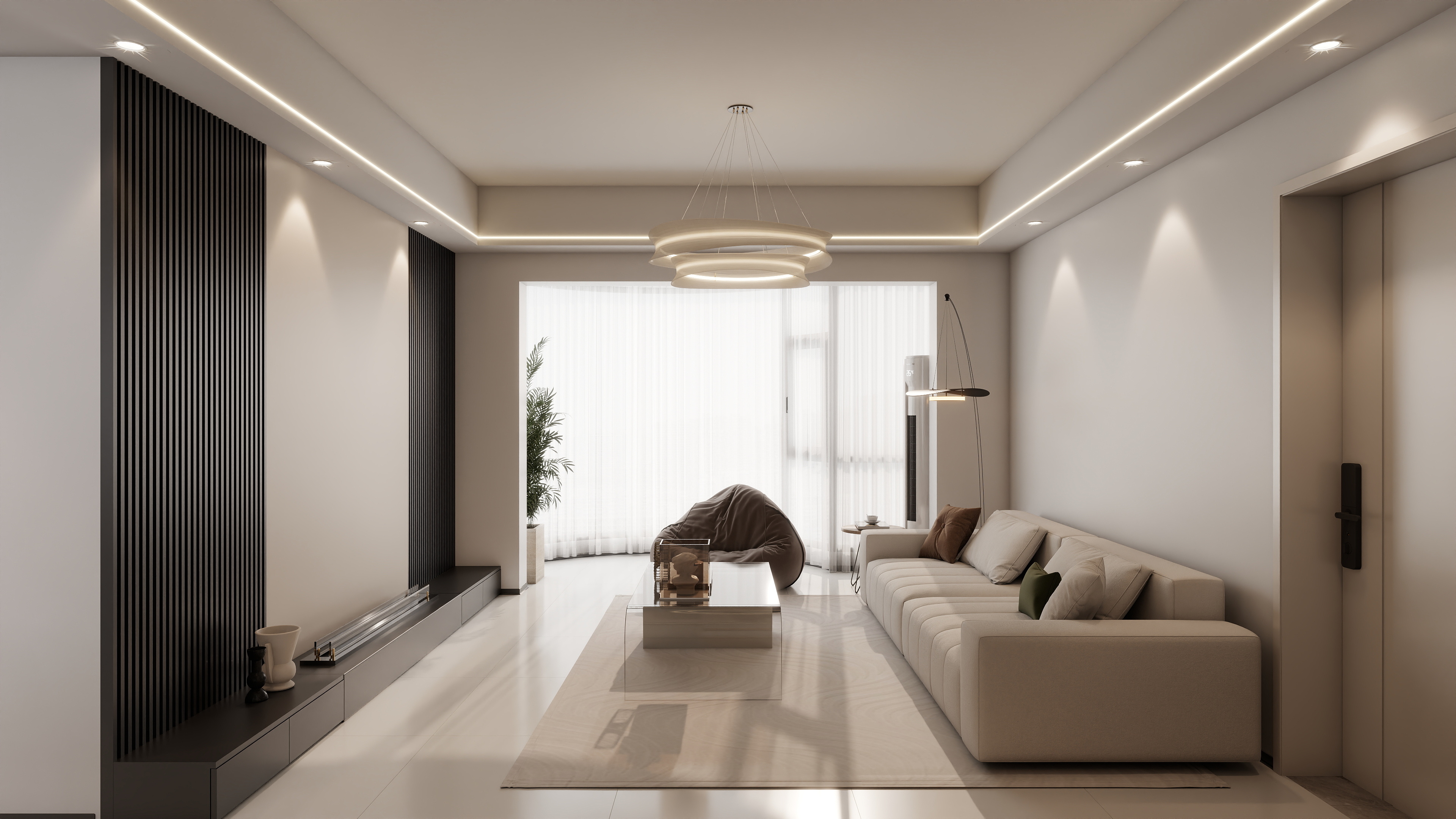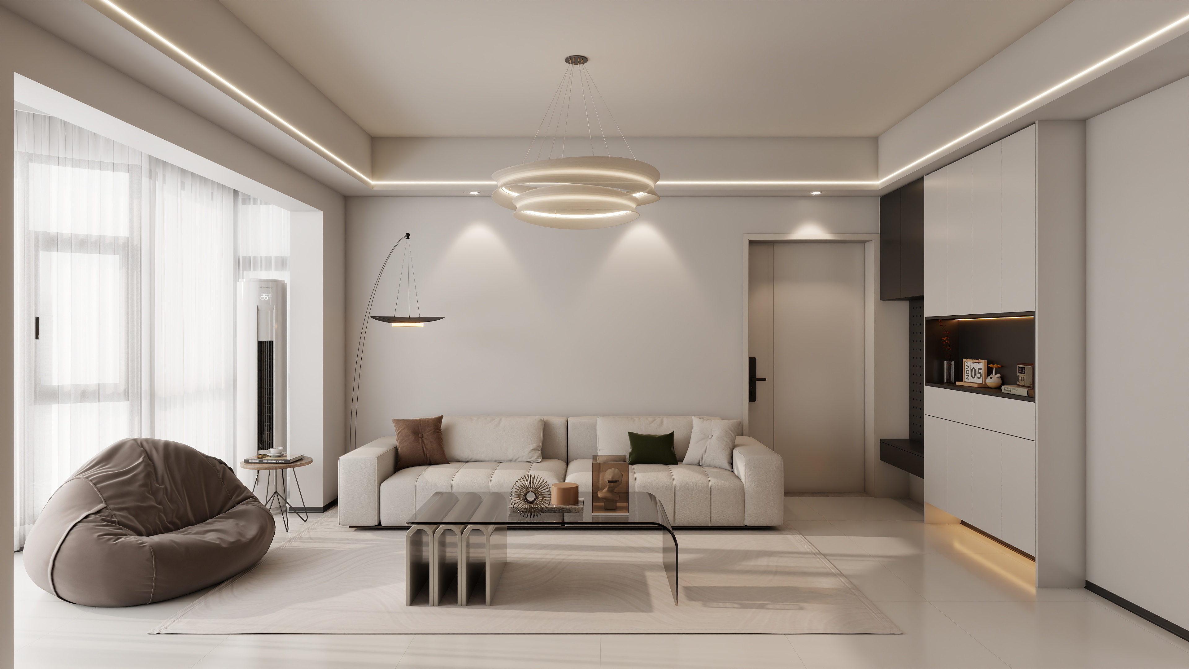 客厅:以米白、浅灰为基调,搭配玻璃、金属等材质,提升空间明亮度。豆腐块沙发与透明玻璃茶几组合,轻盈不压抑。无主灯设计(嵌入式灯带+筒灯)营造均匀光线,环形吊灯作为视觉焦点,搭配弧形落地灯增强层次感。豆袋椅与沙发形成围合式布局,促进互动;大窗搭配纱帘引入自然光,增强通透性。