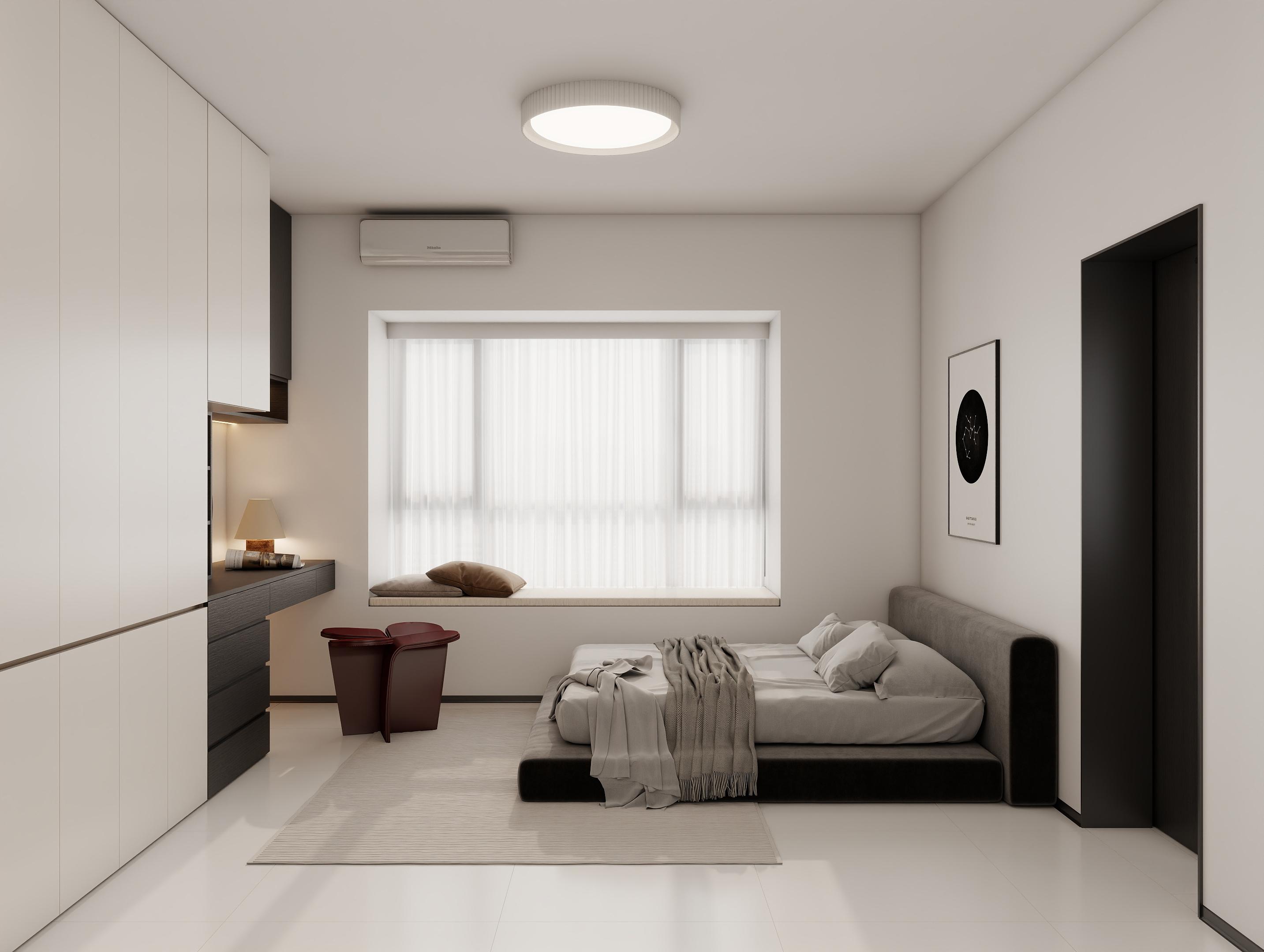 主卧:榻榻米床节省空间,床尾留空方便清洁;飘窗加软垫打造休闲角。衣柜采用白+深色柜体,开放格展示藏品,封闭区收纳衣物,功能分区明确。