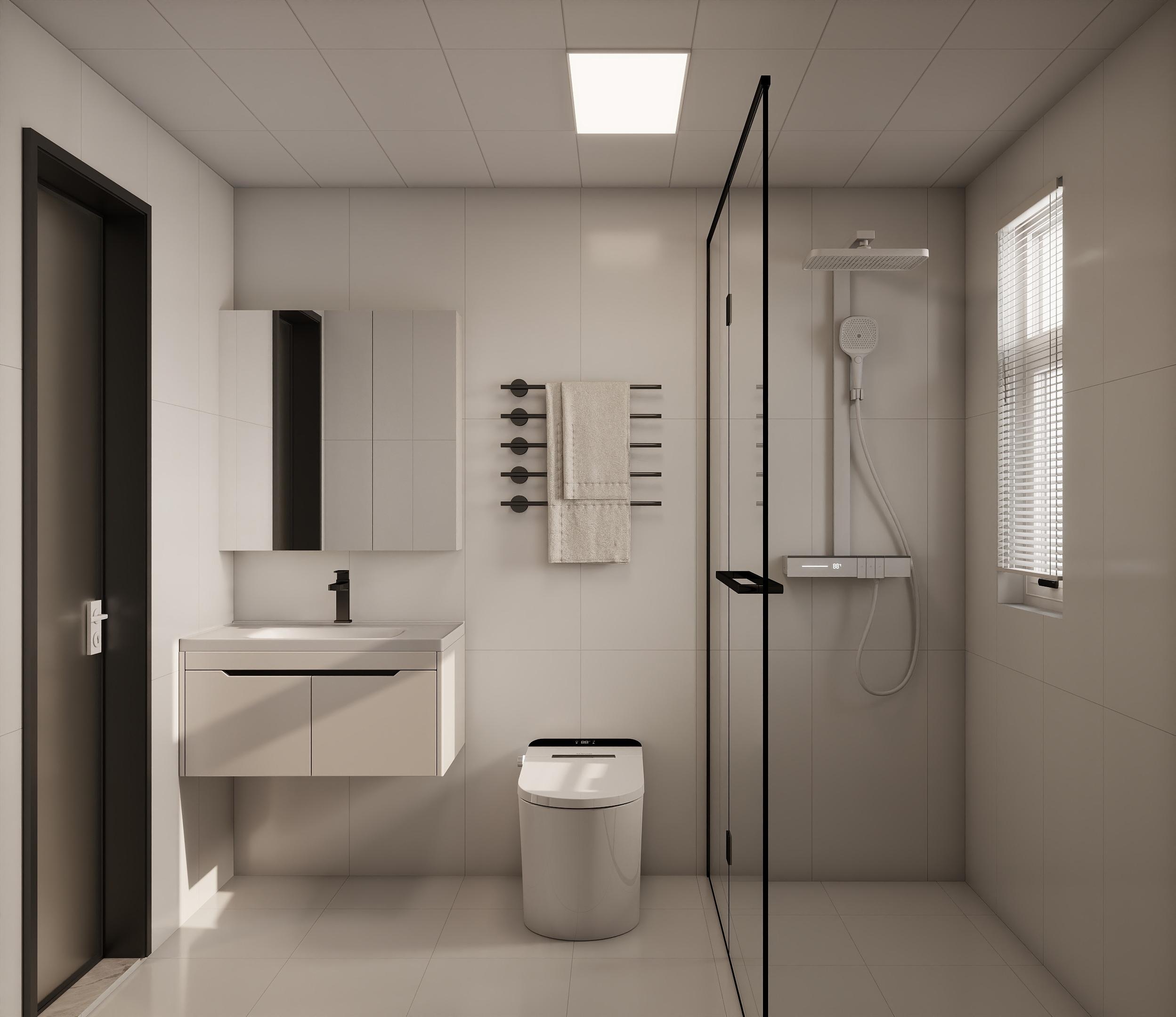 卫生间:玻璃淋浴房实现干湿分离,壁挂式马桶节省空间且易清洁。镜柜与壁龛提供隐形储物,毛巾架设计兼顾实用与美观。浅色瓷砖通铺,提升明亮感;智能马桶增加现代便利性。