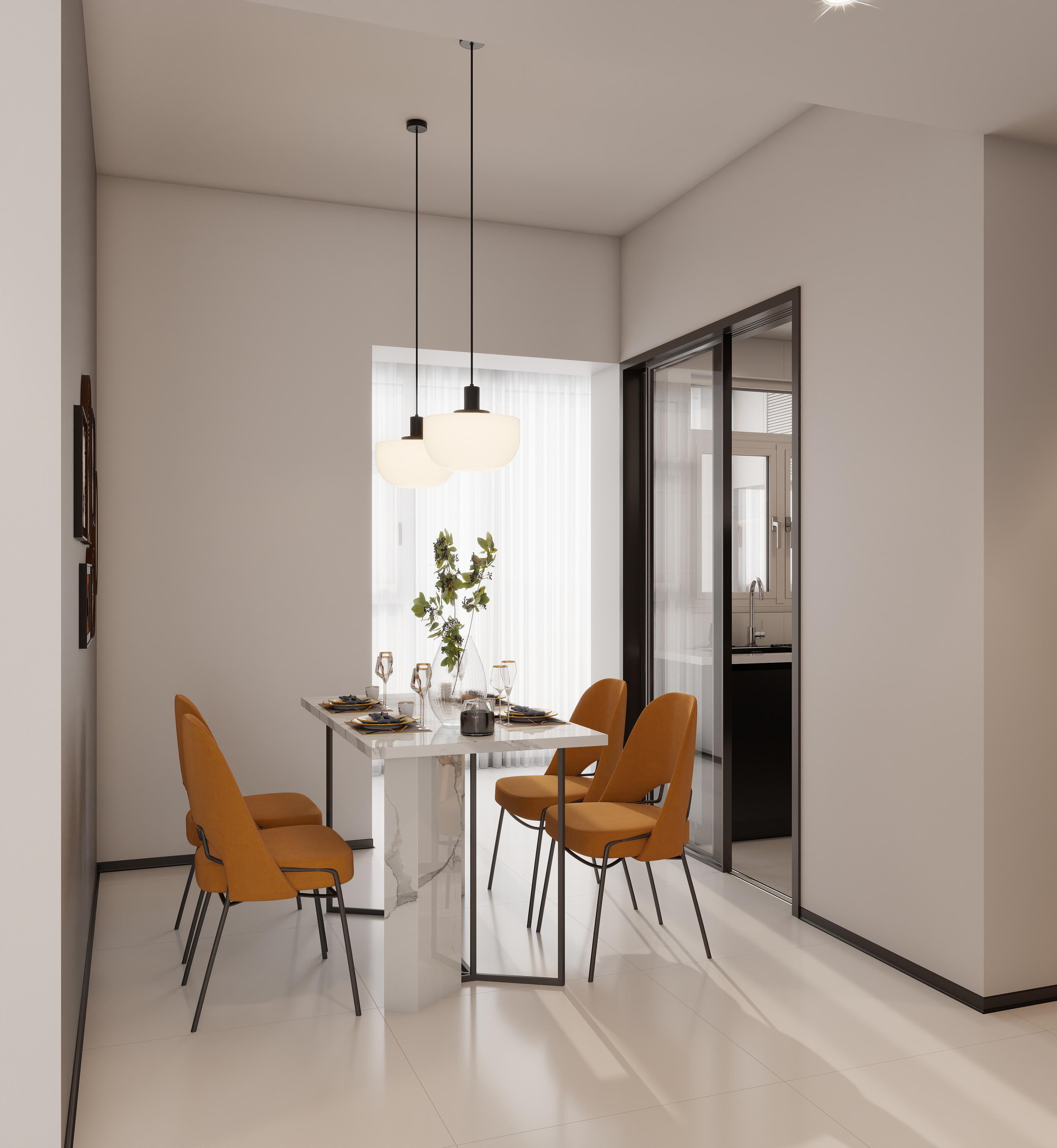 白色大理石餐桌与橙色餐椅形成鲜明对比,打破中性色调的单调感。双球形简约吊灯与餐桌垂直对齐,强化用餐区的仪式感。通过玻璃推拉门与厨房联动,既隔离油烟又保持空间开放感。