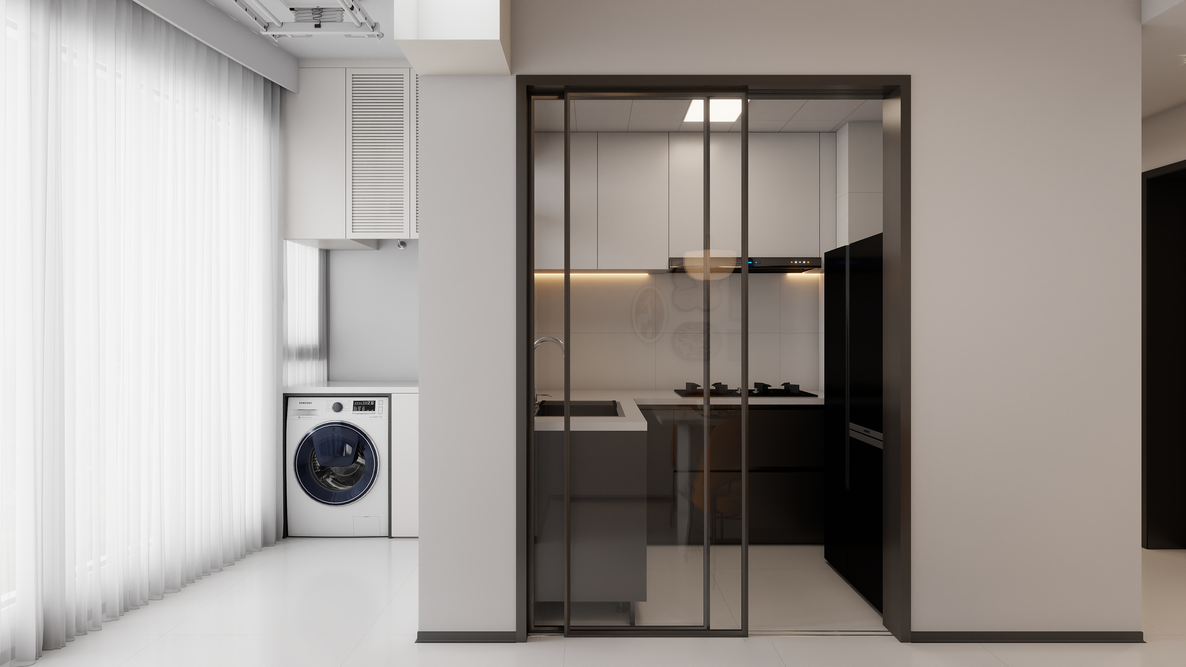 阳台:定制柜嵌入洗衣机,打造家务区;纱帘柔化光线,兼顾实用与美观。